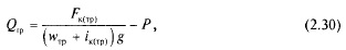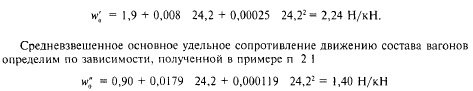 Однако для определения величины щ нужно знать массу состава, т. е. искомую величину. Поэтому формулу (2.29) можно использовать только принимая w0 а . Расчет по этой формуле дает несколько завышенный результат по сравнению с формулой (2.28), и, хотя погрешность составляет менее 1%, при больших значениях массы состава эта погрешность может быть сопоставима с требуемой точностью расчетов (согласно ПТР масса составов грузовых поездов принимается с округлением до 50 т). Значения расчетной скорости vp и расчетной силы тяги грузовых локомотивов F*(р) в соответствии с нормами ПТР приведены в приложении 3. В Правилах тяговых расчетов указано также, что для определения массы состава при проектировании новых железных дорог и электрификации действующих линий силу тяги электровозов следует принимать на 5%, а тепловозов на 7% меньше расчетной, предусмотренной Правилами. С учетом этого указания в приложении 4 приведены значения массы составов грузовых поездов при различных руководящих уклонах, рассчитанные по формуле (2.28) применительно к четырехосным вагонам на роликовый подшипниках при массе, приходящейся на ось q0 = 17,5 т, и для условий движения по бесстыковому пути. Определим массу состава, которую тепловоз 2ТЭ116 может провести по бесстыковому пути на руководящем уклоне = 15%. Значение расчетной силы тяги р), Н, расчетную скорость vp, км/ч, и расчетную массу локомотива Р, т, примем по таблице приложения 3 Основное удельное сопротивление движению локомотива определим по формуле (2.3) ![]()