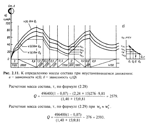 Разница в результатах расчетов по формулам (2.28) и (2.29) составляет 14 т (0,5%). С учетом округления массы состава до 50 т следует принять Q = 2600 т. Расчет массы состава при неустановившемся движении. На существующих железных дорогах, особенно строившихся давно, наряду с затяжными подъемами встречаются короткие, но более крутые подъемы, которые могут оказаться труднейшими для преодоления их поездом. По таким подъемам движение может быть неустановившимся, и тогда расчетную массу состава целесообразно определять методом подбора. По крутизне подъема, меньшей, чем самый крутой подъем на участке, рассчитывают массу состава Q, по формуле (2.28) или (2.29) (принимая wa = ), и для состава данной массы определяют скорость движения поезда на перегоне. Если скорость поезда в конце труднейшего подъема vK, (на рис. 2.11,а — это подъем с уклоном 11,2%с) больше расчетной, то массу состава увеличивают на несколько сотен тонн до значения Q2 и вновь определяют скорость поезда. При vk2 > vp принимают еще большее значение массы состава (результаты указанных расчетов иллюстрирует рис. 2.11,а). Если в результате очередной попытки скорость в конце труднейшего подъема оказывается меньше расчетной скорости, то следует соответственно уменьшить массу состава. Так поступают до тех пор, пока конечная скорость будет равна расчетной. Чтобы ограничиться, как правило, тремя попытками, можно построить по трем значениям vK график зависимости vK(Q) (см Рис 2.11,6), и, отложив на оси ординат значение расчетной скорости для данного типа локомотива, по оси абсцисс определить расчетную массу состава. Масса состава при неустановившемся движении поездов в большой степени зависит от условий накопления кинетической энергии поезда на участках, предшествующих расчетному подъему. Так, если скорость поезда в конце спуска 8,6%о или на подъеме 1,2%с ограничена значением 60 км/ч (см. штриховую линию на рис. 2.11,о), то расчетная масса состава окажется меньше, чем в случае, когда нет ограничения скорости. Следовательно, для обеспечения больших значений массы грузовых поездов путейцам необходимо создать на участках, предшествующих расчетным подъемам, возможность реализации максимальных скоростей движения поездов. Ограничения скоростей на этих участках особенно нежелательны. Проверка массы состава по условию трогания с места, Масса состава, т, который может быть тронут локомотивом с места, определяется по формуле, аналогичной (2.29):