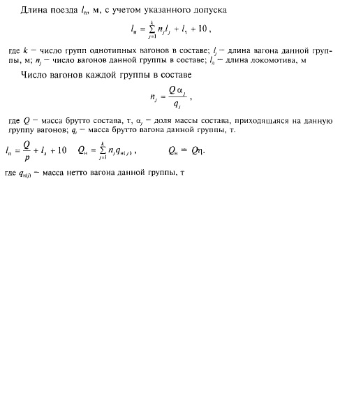 Предусмотренная Правилами тяговых расчетов указанная проверка массы состава заключалась в сопоставлении значений QTp и Q. Когда в вагонном парке было большое число вагонов с подшипниками скольжения, у которых сопротивление при трогании с места wTp в 3—4 раза превышало сопротивление w0 при движении с расчетной скоростью vp на руководящем подъеме, тогда в определенных условиях (в частности, при пологих р) могло иметь место неравенство Qw < Q. В этих случаях на эксплуатируемых линиях приходилось ограничивать норму массы составов величиной 0тр либо при трогании поезда в сторону подъема на станциях, расположенных на соответствующих уклонах, необходимо было использовать дополнительный локомотив (толкач). В настоящее время все вагоны оснащены роликовыми подшипниками, при которых wTp и лишь в поездах с локомотивами, у которых расчетная скорость vp < 25 км/ч, и при этом масса вагонов, приходящаяся на ось q0, меньше 20 т, сопротивление wTp незначительно больше сопротивления w0. Однако и в этом последнем случае, как показывают расчеты, масса состава Отр при трогании поезда с места даже на руководящем подъеме Ок(тр) оказывается больше массы состава Q. Следовательно, при проектировании новых железных дорог проверка массы состава по условию трогания с места потеряла смысл. Проверка массы поезда по длине приемоотправочных путей. Согласно п. 15.26 Правил технической эксплуатации железных дорог (ПТЭ) [49] длины грузовых поездов должны соответствовать полезной длине приемоотправочных путей на станциях. При этом согласно ПТР учитывается допуск 10 м на установку поезда в пределах полезной длины приемоотправочных путей.