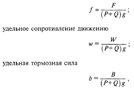 Силы, действующие на поездПолные и удельные силы. В тяговых расчетах рассматриваются только те слагаемые внешних сил, приложенных к поезду, которые направлены вдоль линии движения поезда, так как именно они влияют на поступательное движение поезда по рельсовой колее. Это сила тяги F, сила сопротивления движению поезда W и тормозная сила В Полные силы, т.е. приложенные ко всему поезду, измеряются в ньютонах (Н) или килоньютонах (кН). Удельные силы, приходящиеся на единицу веса поезда, измеряются в Н/кН (вес поезда измеряется в килоньютонах, поскольку масса поезда измеряется в тоннах): удельная сила тяги