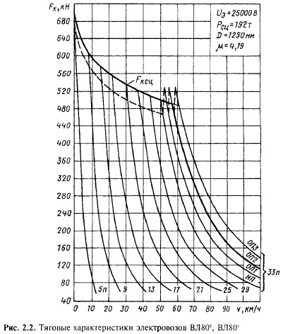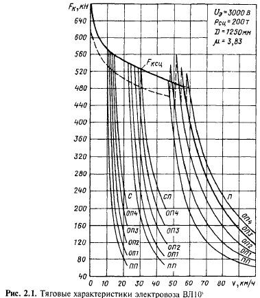 Зависимость силы тяги локомотива от скорости определяется его тяговой характеристикой. На тяговых характеристиках (рис. 2.1—2.3) нанесены кривые ограничения силы тяги по сцеплению (обозначены FKm). У электровозов постоянного тока, например BJI10y, тяговые характеристики представлены семейством кривых FK(v) при различных схемах соединения тяговых электродвигателей (см. рис. 2.1). Переход от последовательной схемы соединения двигателей (С) при трогании поезда с места к последовательнопараллельной (СП) и затем к параллельной схеме (77) повышает напряжение, передаваемое на двигатели, вследствие чего возрастает скорость движения поезда. Скорость движения увеличивается также при ослаблении магнитного поля обмоток возбуждения тяговых двигателей: переходе от полного поля (Я/7) к ослабленному полю различных ступеней (ОП1, ОП2, ОЛЗ, 0П4). При этом также возрастает сила тяги локомотива. В электровозах переменного тока (например, ВЛ80С, ВЛ80Т) двигатели всегда соединены параллельно и напряжение, подаваемое на двигатели, регулируется включением различного числа секций вторичной обмотки главного трансформатора (номера позиций 5п, 9п, 1 Зп, ..., ЗЗп на рис. 2.2).