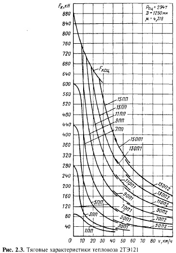 Сила тяги тепловозов регулируется изменением мощности дизеля. Это достигается увеличением или уменьшением количества подаваемого в цилиндры топлива (соответствующей позицией контроллера машиниста). У тепловозов 2ТЭ121 имеется 15 позиций контроллера (см. рис. 2.3). Электродвигатели тепловозов с электрической передачей, так же как электровозов, могут работать в режиме полного и ослабленного магнитных полей. Расчетный режим работы каждого локомотива показан на тяговой характеристике жирной линией. При трогании и разгоне поезда на остановочных пунктах, за которыми располагается трудный подъем, силу тяги электровозов принимают по штриховым линиям, характеризующим наименьшее значение силы тяги в процессе пуска локомотива. Силы сопротивления движению поезда. Различают основное и дополнительные сопротивления движению. Под основным подразумевают сопротивление при движении по прямому горизонтальному участку пути. Оно обусловлено трением шеек осей в подшипниках, трением качения и трением скольжения колес по рельсам и ударами в стыках, а также сопротивлением воздушной среды. Дополнительные сопротивления (сверх основного) возникают при движении поезда на уклонах и в кривых участках пути. Основное удельное сопротивление движению локомотивов, Н/кН, определяют по эмпирическим формулам в зависимости от скорости движения v, км/ч, и конструкции пути: для электровозов и тепловозов в тяговом режиме на звеньевом пути то же в режиме холостого хода ![]()