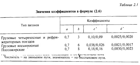 По формуле (2.6) вычисляют также основное удельное сопротивление грузовых восьмиосных вагонов, вагонов рефрижераторных поездов и пассажирских вагонов при скоростях движения до 160 км/ч. Значения коэффициентов в формуле (2.6) зависят от типа вагонов и конструкции пути (табл. 2.1).