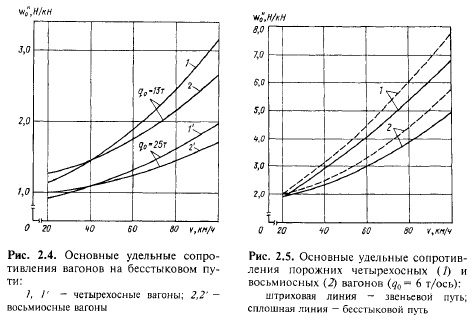 Из формулы (2.6) следует, что чем больше масса вагона, и, следовательно, масса qQ, приходящаяся на ось, тем меньше удельное (на единицу веса вагона) основное сопротивление движению, так как полная величина некоторых его слагаемых (например, сопротивления воздушной среды) от массы вагона не зависит. Влияние величины q0 на удельное сопротивление четырехосных и восьмиосных вагонов при различных скоростях движения иллюстрирует рис. 2.4. Сопротивление движению грузовых вагонов на бесстыковом пути меньше, чем на звеньевом, на 35% при скорости 25 км/ч и на 1215% при 100 км/ч (рис. 2.5). Влияние конструкции пути на удельное сопротивление движению тем больше, чем меньше q0. Расчеты показывают [11], что уменьшение сопротивления движению на бесстыковом пути приводит к экономии расхода топлива и электроэнергии на тягу поездов на 34%.