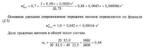 где — основное удельное сопротивление данной группы вагонов, Н/кН, а — доля массы состава, приходящаяся на данную группу вагонов Определим средневзвешенное основное удельное сопротивление движению на бесстыковом пути состава из 20 груженых и 40 порожних четырехосных вагонов Масса тары (собственная масса вагона) составляет 23,5 т, масса брутто груженых вагонов (тара и груз) — 83 т Основное удельное сопротивление груженых вагонов определяется по формуле (2 6) при массе, приходящейся на ось, q0 = 83 / 4 = 20,75 т