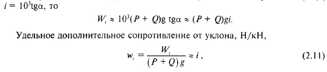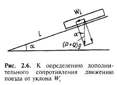 При массе поезда Р + Q, т, и соответственно весе поезда (Р + Q)g, кН, дополнительное сопротивление от уклона, Н, зависит от угла а наклона пути к горизонту: