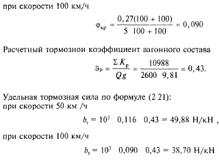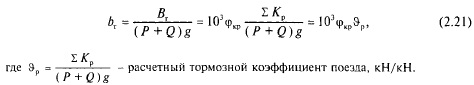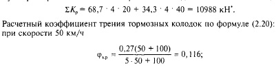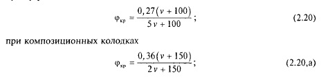 где ZKP сумма расчетных сил нажатия на тормозные оси поезда, кН; в приложении 1 приведены указанные в Справочнике по тяговым расчетам [11] значения Кр для вагонов и локомотивов при автоматическом торможении; <ркр — расчетный коэффициент трения тормозной колодки о колесо. Расчетный коэффициент трения вычисляется по следующим формулам: при чугунных колодках