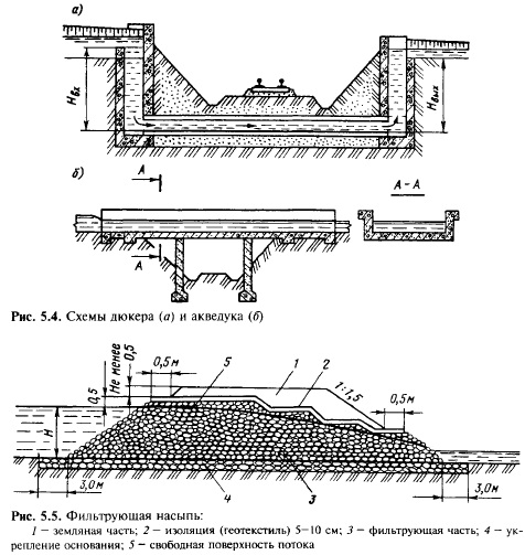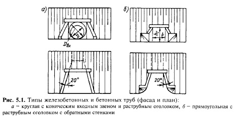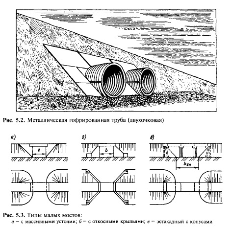 Типы малых водопропускных сооружений и их размещение на трассеМалые водопропускные сооружения. К малым водопропускным сооружениям относятся трубы, мосты длиной до 25 м, лотки, дюкеры, акведуки и фильтрующие насыпи. Эти сооружения размещаются на пересечениях железной дорогой постоянно или периодически действующих водотоков. Водопропускные трубы по форме сечения подразделяются на круглые (рис. 5.1, а) и прямоугольные (рис. 5.1, б). На существующих дорогах имеется некоторое количество овоидальных труб. Применяют следующие типы труб: круглые железобетонные диаметром от 1 до 2 м, круглые из гофрированного металла (рис. 5.2), прямоугольные железобетонные отверстием от 1 до 4 м и бетонные от 1,5 до 6 м. ![]() ![]() Малые мосты в зависимости от формы подмостового сечения подразделяются на два типа: с прямоугольным сечением (рис. 5.3, а, б) и с трапецеидальным (рис. 5.3, в). При строительстве новых железных дорог наиболее часто применяют сборные свайно- и стоечно-эстакадные железобетонные мосты (см. рис. 5.3, в). Лотки закрытые и открытые, прямоугольного сечения отверстием 0,50—0,75 м, преимущественно из железобетона, устраивают между шпалами для пропуска небольшого количества воды при высоте насыпи менее 1 м, недостаточной для укладки труб. Дюкеры (рис. 5.4, а) пропускают небольшое количество воды при зарегулированном стоке (преимущественно на мелиоративной сети) под низкими насыпями или мелкими выемками. При пересечении водотока дорогой в достаточно глубокой выемке может быть устроен акведук — своеобразный мост над дорогой, по пролетному строению которого протекает вода (рис. 5.4, б). ![]() Фильтрующие насыпи, имеющие в своем теле прослойку из крупных камней (рис. 5.5), разрешается сооружать в исключительных случаях на линиях III и IV категорий при малом количестве притекающей воды (до 10 м3/с) и незначительном числе взвешенных частиц грунта в ней. При большем количестве воды строят комбинированные сооружения, состоящие из трубы и фильтрующей насыпи. Размещение водопропускных сооружений. Каждый водоток, как правило, должен быть пропущен через отдельное сооружение. При камеральном трассировании места размещения водопропускных сооружений устанавливаются при сопоставлении продольного профиля с подробным планом трассы. На продольном профиле места размещения водопропускных сооружений определяются понижениями местности, где имеются водотоки (точки 1—5 на рис. 5.6). Пропуск вод близко расположенных один от другого водотоков через одно сооружение (например, водотоков 4 и 5 на рис 5.6) должен быть обоснован соответствующими расчетами, учитывающими затраты на сооружение и содержание водоотводной канавы. При наличии вечномерзлых грунтов, селевого стока, лёссовидных грунтов и возможности образования наледей такие решения не допускаются. В районах вечной мерзлоты на участках с просадочными при оттаивании грунтами водопропускные сооружения проектируют во всех естественных понижениях продольного профиля, а на слабосточных участках их следует предусматривать не реже чем через 500 м. ![]() Территория, с которой атмосферные осадки стекают к водопропускному сооружению, называется водосбором или бассейном сооружения. Водосбор расположен с верховой стороны от трассы и ограничен по периметру линиями водоразделов и полотном дороги (рис. 5.7). Линия, соединяющая наиболее пониженные 