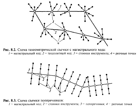 В результате измерений устанавливают и распределяют угловую и линейную невязки и вычисляют координаты стоянок магистрального хода. Затем стоянки магистрального хода наносят на план (планшеты) и указывают отметки каждой из них. Весьма эффективно при прокладке магистральных ходов могут быть использованы электронные тахеометры, соединившие в себе электронный теодолит, светодальномер и микроЭВМ. Этими приборами измеряют горизонтальный и вертикальный утлы, наклонное расстояние и горизонтальное проложение, превышения и высоты, приращения координат и сами координаты. Результаты измерений могут быть записаны в модуль оперативной памяти. В японских электронных тахеометрах SET 300 или SET 500 результаты измерений высвечиваются на дисплее (рис. 8.1), к инструменту может быть подключен персональный компьютер или принтер. Съемка полосы местности вдоль магистрального хода. Планово-высотная съемка с магистрального хода должна охватывать полосу, в которой пройдет будущая трасса, шириной, достаточной для варьирования (обычно до 100—200 м в каждую сторону от намечаемого положения трассы). В зависимости от протяженности и условий прокладки проектируемой трассы применяются тахеометрическая съемка, нивелирование поверхности, наземный фототопографический, стереотопографический, аэрофотосъемоч- ный и другие методы вплоть до использования спутниковой геодезической аппаратуры. При этом съемку таких линейных объектов большой протяженности, как магистральные железные дороги, рекомендуется, как правило, вести аэрофототопографическим методом, а наземную топосъемку производить в тех случаях, когда применение аэрофотосъемки экономически нецелесообразно, по каким-либо причинам невозможно или не обеспечи-вает достаточную для трассирования точность плановых материалов. Наиболее распространенный вид наземной съемки планов на железнодорожных изысканиях — тахеометрическая съемка. Тахеометрическую съемку выполняют со стоянок магистрального хода и при необходимости — с коротких теодолитных ходов, опирающихся на магистральный ход (рис. 8.2). Съемку можно осуществлять с пунктов (точек) съемочного обоснования — стоянок инструмента, пикетов и плюсовых точек магистрального хода как “поперечниками” (рис. 8.3), так и методом обычной площадной съемки. Густота реечных точек зависит от масштаба съемки, сложности рельефа и контуров местности. В обычных условиях расстояния между точками не должны превышать 2 см на плане.