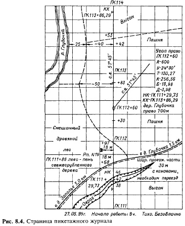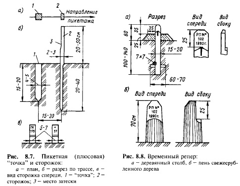 Пикеты и плюсы закрепляют по оси трассы “точками” и сторожками (рис. 8.7), дублируя пикеты на тангенсах угла поворота. Сторожок забивают на расстоянии 15—20 см от “точки” вперед по ходу пикетажа, надпись на сторожке обращают в сторону точки. Кривые закрепляют “точками” через 20 м, а кривые малых радиусов — через 10 м. Закрепляют также начало и конец переходных кривых и середину круговой кривой. Временные реперы устанавливают вне границ будущих земляных работ через 2 км, а также вблизи переходов через крупные водотоки. Временным репером обычно служит просмоленный или обожженный на костре деревянный столб с крестообразной перекладиной в нижней части, который закапывают в землю ниже глубины промерзания (рис. 8.8,а). В лесистой местности, и особенно в районах вечной мерзлоты, в качестве временных реперов вместо столбов лучше использовать крепкие пни срубленных де-ревьев, соответственно оформив верхнюю часть пня (рис. 8.8,6).