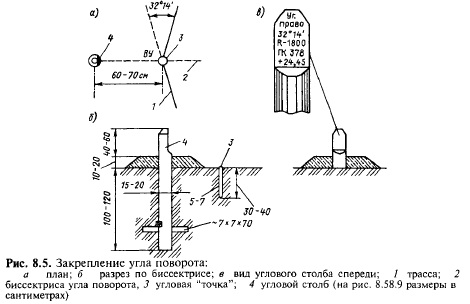 Разбивку кривых по окончательной трассе осуществляют, как правило, с использованием специальных таблиц, в пояснениях к которым указан порядок и примеры пользования ими. Наиболее простым способом разбивки кривых, обеспечивающим достаточную точность, является разбивка методом прямоугольных координат. При этом точки оси пути выносят от тангенсов под прямым углом на величину смещений, определяемых по таблицам. В стесненных условиях, когда разбивка кривых методом прямоугольных координат затруднена, например, в застроенной местности, может быть применен способ разбивки кривых засечками теодолитом, установленным в точке начала (конца) кривой. Высоты точек при прокладке окончательной трассы на местности определяют двойным геометрическим нивелированием по оси пути с разбитыми кривыми. Первым нивелиром устанавливают отметки всех точек трассы, вторым осуществляют контроль по связующим точкам. Нивелирование участков трассы должно начинаться и заканчиваться на реперах или марках государственной или ведомственной сети. Камеральную обработку материалов полевых работ ведут, как правило, в конце каждого рабочего дня. При этом подсчитывают координаты вершин углов поворота трассы и привязкой к магистральному ходу проверяют правильность линейных и угловых измерений, вычисляют и увязывают отметки пикетов и всех плюсовых точек по результатам продольного нивелирования, вычерчивают линию земли продольного профиля трассы и наносят проектную линию. Если полученный продольный профиль проектируемой линии удовлетворяет всем техническим и экономическим требованиям, то на следующий день осуществляют дальнейшую прокладку трассы. В случае, если полученное решение не удовлетворяет предъявляемым к профилю требованиям и необходимо смещение трассы на местности, приходится сразу же камерально рассчитать и перетрассировать по планам неудачный участок, после чего произвести его перебивку в поле. Закрепление трассы на местности должно обеспечить долговременное сохранение установленных знаков с тем, чтобы в процессе строительства и при сдаче дороги в эксплуатацию можно было инструментально проверить соответствие выполненных строительных работ проекту. Угол поворота трассы (магистрального хода) закрепляют “точкой” (колышком), забиваемой в уровень с землей, и угловым столбом, устанавливаемым с внешней стороны угла поворота по направлению продолжения биссектрисы на расстоянии 6070 см от угловой “точки” (рис. 8.5). В лесу в качестве угловых столбов могут быть использованы удобно расположенные пни деревьев.