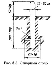 Створными столбами (рис. 8.6) закрепляют ось трассы на прямых большой протяженности, а также переходы рек, путепроводы и тоннельные пересечения. В пределах прямых створные столбы устанавливают не реже чем через 1000 м. В обжитых и безлесных районах рекомендуется применять бетонные столбы.