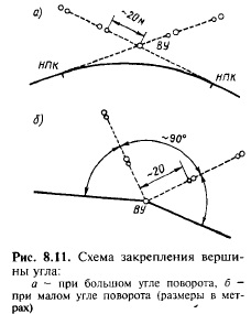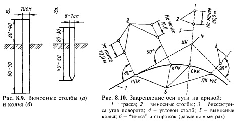 Если в районе изысканий отсутствуют постоянные нивелирные знаки, то при окончательной разбивке трассы кроме временных реперов устанавливают постоянные реперы не реже чем через 50 км. Их размещают в пунктах расположения крупных станций, больших мостов, тоннелей в соответствии с требованиями, предъявляемыми инструкциями к постоянным опорным знакам для нивелирования III и IV классов. При восстановлении линии под строительство осуществляют предпо- строечное закрепление трассы выносками осевых точек. Выносные столбы и колья (рис. 8.9) размещают на таком расстоянии от оси трассы, чтобы они не были снесены во время производства земляных работ. На прямых участках ось пути закрепляют на четных пикетах так называемыми створными столбами, размещаемыми преимущественно с нагорной стороны в створе, перпендикулярном оси трассы. В пределах кривой закрепляют вершину угла поворота, начало и конец переходных кривых, а также четные пикеты (рис. 8.10). Если вершина угла поворота находится на близком расстоянии от земляного полотна и угловой столб может оказаться в зоне строительных работ, то точку вершины угла закрепляют двумя пересекающимися створами из четырех выносных столбов, располагаемых на продолжениях прямых участков трассы (рис. 8.11, а). При малых углах поворота закрепление целесообразно осуществлять створами, удобно ориентированными на местности (рис. 8.11, б). Угол между такими створами принимают близким к 90°. Этот угол, а также углы между створными линиями и прямыми участками трассы, измеряют теодолитом.