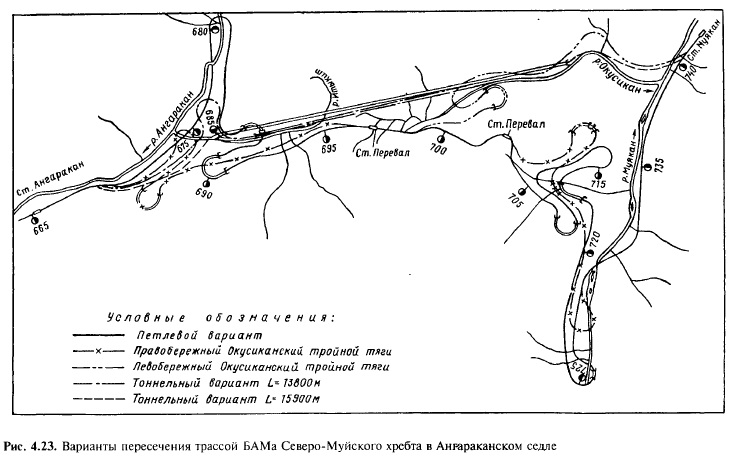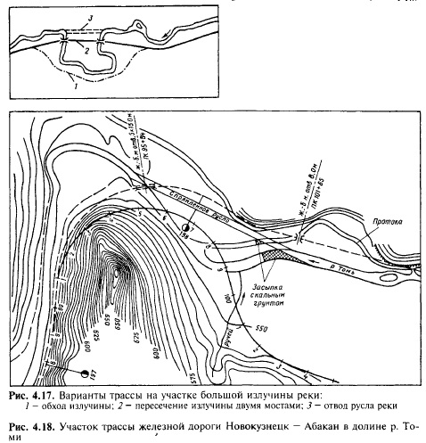 Трассирование в различных топографических условияхТрассирование в долинах рек. Долинные ходы трассы, проложенные вдоль рек, создают благоприятные условия для водоснабжения станций и станционных поселков, но характерны большим числом пересекаемых водотоков (притоков реки), что увеличивает стоимость искусственных сооружений. В равнинной местности долины рек малоизвилисты, с широкими террасами. Трасса в этих условиях располагается на одной из надпойменных террас. Такие участки трассы называют долинно-террасовым ходом. В пересеченной местности долины более извилистые. На участках больших излучин реки наряду с вариантом удлинения линии для обхода излучины необходимо изучить возможность пересечения реки двумя мостами либо отвода русла реки (рис. 4.17). На 198—199 километрах трассы железнодорожной линии Новокузнецк — Абакан р. Томь имеет крутую излучину, огибающую узкий и высокий скальный мыс левобережного склона долины (рис. 4.18). При проектировании дороги рассматривалось несколько вариантов [53]. Укладка трассы на всем протяжении участка по левому берегу реки приводила к пересечению скального мыса тоннелем протяженностью 300 м. В бестоннельном варианте (штриховая линия на рис. 4.18) трасса пересекала русло р. Томи, на некотором протяжении следовала по правому берегу реки, но затем для подхода к участковой станции Бискамжа вновь переходила на левый берег с устройством мостовых переходов через р. Томь и ее приток Тузуксу. Лучшим оказался вариант трассы, пересекающей выступающий мыс выемкой максимальной глубиной около 19 м и дважды пересекающей русло р. Томи насыпями из скального грунта (жирная линия на рис. 4.18). В связи с перекрытием реки осуществлено спрямление ее русла прорытием канала длиной 500 м, шириной по дну 15 м и средней глубиной 1,0—1,2 м. Принятое решение исключило необходимость строительства трех мостовых переходов и, сокращая длину трассы более чем на 300 м по сравнению с правобережным вариантом, значительно снизило стоимость строительства.