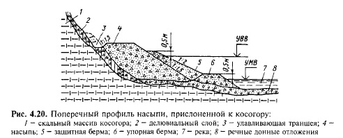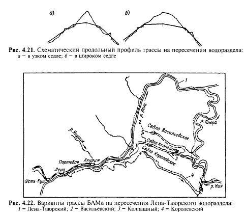 В горных районах, где реки текут в ущельях с крутыми склонами (косогорами) без террас, трасса может быть уложена либо на косогоре выше уровня высоких вод (долинно-косогорный ход) либо у подошвы косогора. В косогор из прочных скальных пород основную площадку земляного полотна можно врезать в виде полувыемки (рис. 4.19). Учитывая сложность сооружения второго пути на таких участках в условиях движения поездов, выемки на крутых косогорах и на прижимах рек, как и выемки глубиной более 6 м, располагаемые в скальных породах на железных дорогах И кате-гории и выше, согласно Строительно-техническим нормам СТН Ц-01-95 проектируют под два пути. Для обеспечения безопасности движения поездов на участках, где возможен камнепад, между основанием откоса и основной площадкой земляного полотна устраивают улавливающую траншею (см. рис. 4.19). На крутых косогорах, сложенных слабыми скальными породами или переувлажненными обыкновенными грунтами, укладка трассы, как правило, нецелесообразна, так как для обеспечения устойчивости земляного полотна на таких участках необходимы дорогостоящие сооружения: разветвленная система дренажей, подпорные стены и др., строительство которых трудно механизировать. Кроме того, такие участки пути требуют больших расходов труда и средств в период эксплуатации. ![]() ![]() Опыт строительства железных дорог в горных районах Сибири показал, что вместо укладки трассы на крутых неустойчивых косогорах целесообразно размещать земляное полотно у их подошвы, отсыпая насыпи скальным фунтом в русло реки (рис. 4.20). Многолетний опыт успешной эксплуатации таких участков пути на железных дорогах Новокузнецк — Абакан (в долине р. Томи), Абакан - Тайшет (в долине р. Туманшет) и других дал основание применить подобные решения на ряде участков Байкало- Амурской магистрали по долинам рек Олекмы, Нюкжи и др. Несмотря на большие объемы строительных работ и сложный план линий в узких ущельях, в горных условиях укладка трассы попутными долинными ходами нередко является единственно возможным решением. Трассирование на водоразделах. Водораздельные ходы наиболее часто применяются при проектировании железных дорог в равнинных и слабо холмистых районах, где водоразделы широки, имеют благоприятное очертание в плане и относительно небольшое колебание отметок. Геологические и гидрологические условия этих водоразделов обычно благоприятствуют сооружению железных дорог. Для водораздельных участков трассы характерны небольшие объемы земляных работ и в отличие от долинных ходов небольшое количество водопропускных сооружений либо полное их отсутствие, если трасса уложена по самой водораздельной линии. Недостатком водораздельных ходов в сравнении с долинными ходами является сложность и большая стоимость устройств водоснабжения станций и поселков. Трассирование поперечно-водораздельными ходами. Одним из основных вопросов, подлежащих решению при укладке трассы поперечноводораздельным ходом, является выбор места пересечения водораздела. Если проектируется устройство перевальной выемки, то водораздел пересекают, как правило, в одном из седел. Желательно, чтобы выбранное седло совпадало с кратчайшим направлением трассы и имело наиболее низкую отметку, что позволит уменьшить глубину перевальной выемки. Кроме того, преимущество имеет более у