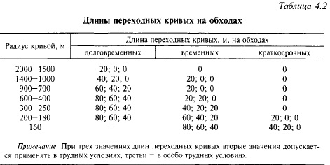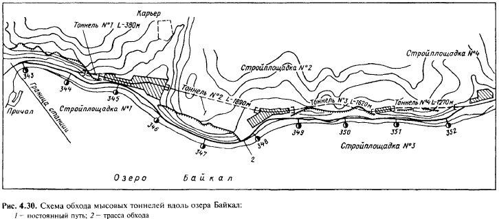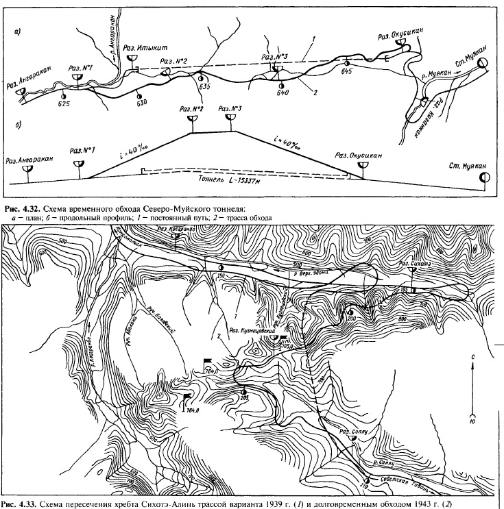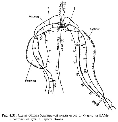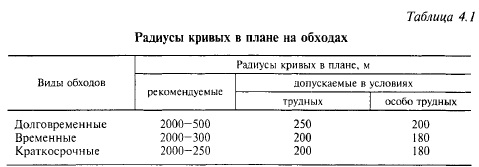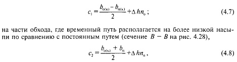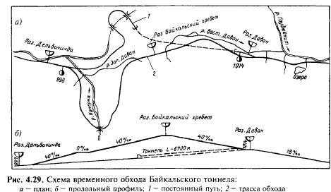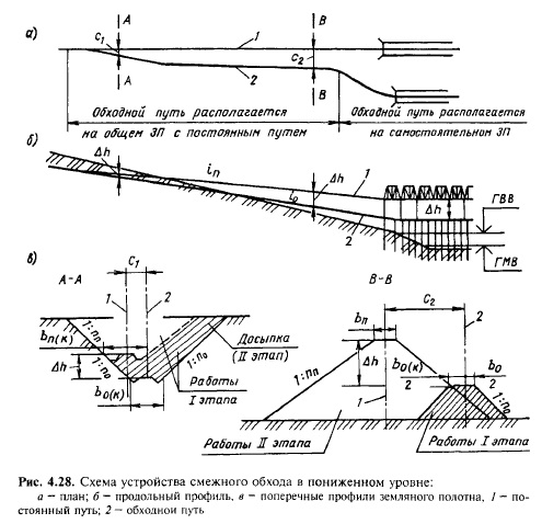 Трассирование обходов барьерных местБарьерные места и назначение обходов. На многих железных дорогах, проектируемых в сложных природных условиях, встречаются участки трассы, на строительство которых требуется значительно больше времени, труда, финансов, чем на сооружение смежных более простых участков. Такие сложные участки называют барьерными местами. К барьерным объектам относятся тоннели, большие мостовые переходы, виадуки, очень высокие насыпи, глубокие выемки. Для ускорения укладки сплошного рельсового пути и открытия в установленный срок сквозного движения поездов на строящейся линии, а иногда и для снижения первоначальных строительных затрат проектируют и сооружают обходы барьерных мест. По продолжительности действия обходы подразделяют на краткосрочные, временные и долговременные. Краткосрочные обходы предназначаются для организации рабочего движения поездов со строительными материалами, конструкциями, строительной техникой и используются в течение короткого периода времени, как правило, не более года. Временные обходы предназначаются для использования в течение нескольких лет и могут применяться в период временной эксплуатации линии для перевозки строительных и хозяйственных грузов. Долговременные обходы предназначаются для эксплуатации в течение длительного времени до сдачи линии в постоянную эксплуатацию. При соответствующем обосновании такие обходы могут использоваться и после сдачи линии в постоянную эксплуатацию. Трасса обходов. По расположению трассы обхода относительно постоянной трассы несколько условно различают смежные и дальние (глубокие) обходы [5]. Смежным называют обход, ось которого располагается в непосредственной близости (примерно до 1 км) от проектной трассы и положение которого может быть определено расчетом. При этом в целях сокращения объема бросовых земляных работ путь на части обхода может располагаться на общем земляном полотне с постоянным путем (рис. 4.28). В этом случае расстояния между осями постоянного пути и временного обхода (с, и с2 на рис. 4.28) рассчитываются в зависимости от разности уровней этих путей: на части обхода, где временный путь располагается в более глубокой выемке по сравнению с постоянным путем (сечение А - А на рис. 4.28), ![]() ![]() Смежный обход целесообразно проектировать в такой последовательности: проектируют продольный профиль обходного пути и определяют образующуюся разницу в уровнях постоянного и обходного путей Ah в характерных точках; назначают типы поперечных профилей земляного полотна обходного пути, исходя из значений Ah и местных условий; вычисляют величину потребного удаления оси обхода от постоянного пути с в характерных точках; исходя из значений с проектируют план обхода и определяют окончательные величины с; окончательно проектируют поперечные профили земляного полотна. Глубоким обходом называют обход, трасса которого находится на значительном удалении (более 1—2 км) от оси постоянного пути. При трассировании таких обходов нужно учитывать следующие положения [35]. Трассу обхода целесообразно приближать к карьерам (земляным, балластным) с тем, чтобы эти материалы могли быть использованы при сооружении и обхода, и постоянной трассы. При трассировании обходов необходимо учитывать возможность использования в будущем участков обхо