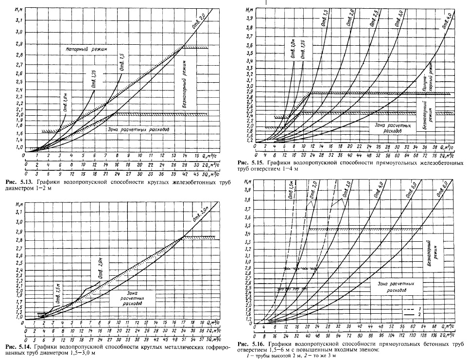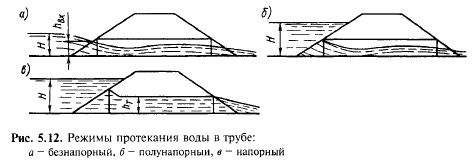 Водопропускная способность труб и малых мостовРасчетные и наибольшие расходы. Водопропускные сооружения рассчитывают на воздействие водного потока при двух расходах: расчетном и наибольшем. Вероятности превышения расходов и соответствующих им уровней принимают следующие: для железных дорог III категорий и выше — 1 % при расчетных паводках и 0,33 % при наибольших паводках; для линий IV категории — 2 % при расчетных паводках и 1 % при наибольших паводках. Для водопропускных сооружений на подъездных путях IV категории, на которых по условиям технологии производства не допускаются перерывы в движении поездов, вероятность превышения расчетных расходов и соответствующих им уровней воды принимают равной 1 %. Водопропускная способность труб. Различают следующие режимы работы труб: безнапорный — входное сечение не затоплено и на всем протяжении трубы поток имеет свободную поверхность (рис. 5.12,о); полунапорный — входное сечение трубы затоплено, а на остальном протяжении поток имеет свободную поверхность (рис. 5.12,6); напорный — входное сечение трубы затоплено и на большей части длины труба работает полным сечением (рис. 5.12,в). Расчетные расходы в трубах должны пропускаться в безнапорном режиме. Согласно Строительно-техническим нормам СТН Ц-01-95 полунапорный режим может быть допущен только в случае пропуска наи-большего расхода водотока и когда у трубы имеется фундамент. При этом необходимо обеспечить водонепроницаемость швов между звеньями трубы и устойчивость насыпи против фильтрации. Для труб, расположенных в районах с низкими температурами (где средняя температура наружного воздуха наиболее холодной пятидневки ниже —40 °С), не допускается предусматривать полунапорный режим работы, за исключением случаев расположения труб на скальном основании. Согласно нормам проектирования возвышение высшей точки внутренней поверхности трубы над уровнем воды в ней при расчетном расходе и безнапорном режиме должно быть: в круглых и сводчатых трубах — не менее 1/4 высоты трубы в свету при высоте ее до 3 м и не менее 0,75 м при высоте трубы более 3 м;