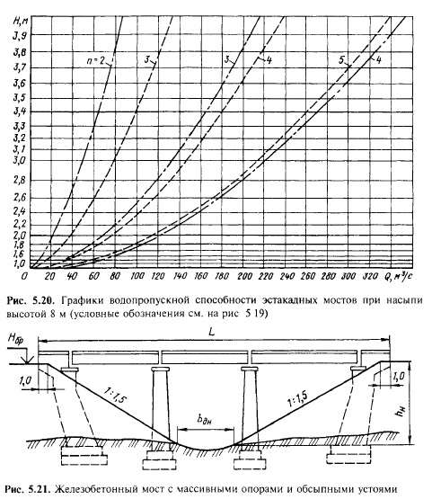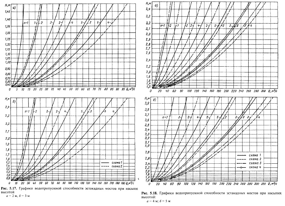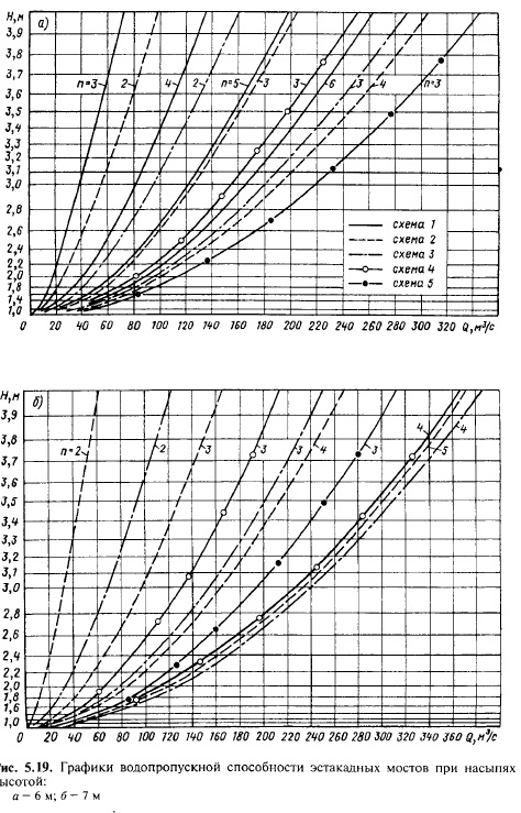 В металлических гофрированных трубах наибольший расход должен пропускаться в безнапорном режиме, а заполнение входного сечения трубы не должно превышать 0,9 высоты трубы. На рис. 5.13—5.16 приведены построенные В.А. Копыленко графики во-допропускной способности труб в зависимости от глубины подпертой воды перед трубой (напора) Н [30]. В соответствии с указанными ограничениями в режимах пропуска воды через трубы на графиках показана зона расчетных расходов. Ограничение наибольших допускаемых расходов определяется максимальной скоростью воды на выходе из трубы. Значения 2Q и 3Q по оси абсцисс соответствуют водопропускной способности двух- и трехочковых труб. Водопропускная способность мостов. Длина пролетных строений сборных железобетонных мостов эстакадного типа (см. рис. 5.3,в) составляет 6,0; 9,3; 11,5; 13,5 и 16,5 м. Эти мосты применяют, как правило, при высоте насыпи от 2 до 8 м. Обычно используют следующие схемы разбивки отверстия моста на пролеты: 1) 6,0 м х п\ 2) 9,3 м х п; 3) 11,5 м х п; 4) 9,3 + + 13,5 х т + 9,3 м; 5) 11,5 + 16,5 х т + 11,5 м; где п — общее число пролетов в схеме моста; т — число внутренних пролетов. Наряду с указанными схемами могут быть применены и другие с различным сочетанием длин крайних и внутренних пролетов. Целесообразность применения различных пролетных строений определяется высотой насыпи на подходах к мосту. При насыпях высотой до 4 м используют пролетные строения длиной 6; 9,3 и 11,5 м. При большей высоте насыпи (до 6 м) применяют мосты со всеми указанными выше типами пролетных строений. При насыпях высотой более 6 м использовать пролетные строения длиной 6 м не следует, так как при высоких насыпях возрастает стоимость опор и поэтому целесообразно принимать пролетные строения большей длины, уменьшая число пролетов и соответственно количество опор моста. ![]() ![]() ![]() ![]() При высоте насыпи более 7—8 м мосты с трапецеидальной формой подмостового сечения имеют длину более 25 м, т.е. относятся уже к средним мостам. Их сооружают со стоечными или массивными опорами, обсыпными устоями (рис. 5.21); длина железобетонных пролетных строений достигает 18,7; 23,6; 27,6 и 34,2 м. Водопропускную способность мостов с обсыпными устоями можно определить в зависимости от ширины русла по дну Ьян и напора Н (рис. 5.22 [30]). ![]() Изыскания и проектирование железных дорог. — М.: ИКЦ «Академкнига», 2003. - 288 с.. |