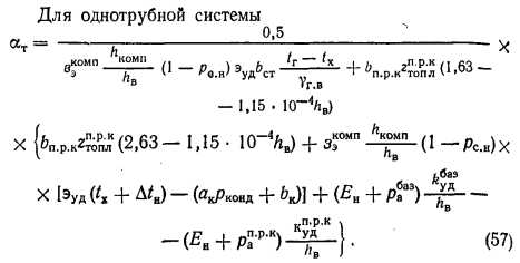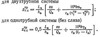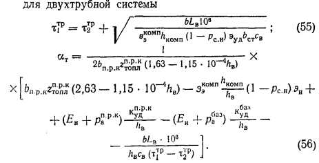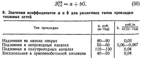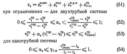 ИНЖЕНЕРНАЯ МЕТОДИКА КОМПЛЕКСНОЙ ОПТИМИЗАЦИИ ПАРАМЕТРОВ СИСТЕМ ДАЛЬНЕГО ТЕПЛОСНАБЖЕНИЯВ связи с необходимостью удаления площадок крупных электростанций от городов особо актуальной становится задача оптимизации параметров систем дальнего теплоснабжения, которая должна практически решаться при разработке схем теплоснабжения и проектов дальних теплопроводов. При решении указанной задачи необходимо выбрать сочетание оптимальных значений коэффициента теплофикации (ат), расчетной температуры сетевой воды в транзитной магистрали на выходе из базового источника теплоты (тр, °С), диаметра (d, м) и числа ниток (г) двух- или однотрубных транзитных трубопроводов. Поскольку дальний транспорт теплоты осуществляется, как правило, в виде горячей воды от крупных электростанций, работающих на различных видах топлива, появляется возможность упростить постановку и решение рассматриваемой задачи комплексной оптимизации параметров. В частности, в подавляющем большинстве проектируемых объектов температурный график во внутригородских сетях от ПРК является заданным, что исключает из оптимизации (см. гл. 3.2) три переменные: расчетные температуры сетевой воды в подающей и обратной линиях внутригородских тепловых сетей, а также соответствующее удельное падение Давления на трение. При построении оптимизационной математической модели теплофикационной системы дальнего теплоснабжения могут быть использованы две основные схемы: закрытая двухтрубная и открытая с однотрубным транзитом. В качестве основных факторов приняты: расчетная тепловая нагрузка Q- МВт; число часов использования максимума тепловой нагрузки hB, ч/год; приведенная (по обороту теплоты, материальной характеристике или капиталовложениям длина транзитных тепловых сетей) LB, км; замыкающие затраты на топливо для пиково-резервных котельных руб./т ; замыкающие затраты на компенсирующую электроэнергию Зэ0МП, руб./МВт ч. Удельные приведенные затраты на единицу длины транзитных тепловых сетей, включая постоянную (капитальную) составляющую, затраты на перекачку и тепловые потери, определяются с помощью экономических характеристик (рис. 6) — зависимости от расхода теплоносителя с учетом технических ограничений на его ![]() ![]() ![]() Тогда математическая модель задачи комплексной оптимизации параметров теплофикационных систем дальнего теплоснабжения формируется следующим образом: минимизировать целевую функцию удельных приведенных затрат на тепловую энергию ![]() Независимыми переменными, подлежащими оптимизации, являются ат и для двухтрубной и ат для однотрубной систем. Приравнивая нулю первые частные производные целевой функции (51) по независимым переменным, получим формулы для нахождения в явном виде их оптимальных значений: для двухтрубной системы ![]() ![]() По формуле (55) построена номограмма (рис. 7), позволяющая оперативно определять оптимальные значения т{р. Формулы (55), (56), и (57) позволяют определять оптимальные значения параметров без учета ограничений. Чтобы учесть ограничения, выполняют следующие: для однотрубной системы после расчета ат по формуле (57) необходимо проверить ограничение (54) и при его невыполнении скорректировать ат. Для двухтрубной системы сначала необходимо определить т]р по формуле (55) или по номограмме (рис. 7), проверить правую часть ограничения (53), а з