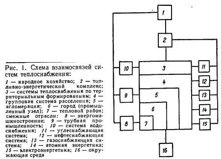 ОСНОВНЫЕ СВОЙСТВА ТЕПЛОСНАБЖАЮЩИХ СИСТЕМТепловое хозяйство является крупнейшим потребителем энергетических ресурсов страны. Для производства теплоты низкой (до 150 °С) и средней (до 350—400 °С) температуры расходуется около трети энергоресурсов, что по данным [47] составляет ежегодно в пересчете на условное топливо около 600 млн. т. В сфере теплоснабжения занято до 4 млн. чел., а ежегодные капиталовложения в объекты теплоснабжения (источники теплоты, тепловые сети, тепловые пункты и абонентские установки) измеряются миллиардами рублей. В то же время структура теплового хозяйства и уровень его эксплуатации в целом требуют совершенствования. В настоящее время около 60 % теплопотребности промышленности и жилищно-коммунального хозяйства обеспечивается от источника теплоты единичной мощностью не менее 60 МВт, относящихся к централизованному теплоснабжению (в том числе в городах около 70 %). Остальная часть теплопотребления покрывается многочисленными малоэкономичными мелкими котельными (их около 250 тыс.) и индивидуальными (главным образом, бытовыми) установками. Последнее обстоятельство является источником значительного перерасхода топлива, трудовых и капитальных затрат. Поэтому генеральным направлением развития теплового хозяйства СССР является как в настоящее время, так и в обозримой перспективе, централизация теплоснабжения, которая обеспечивает качественное решение важнейших социальных, экономических и экологических задач. Расчеты показывают, что экономически оправданный уровень централизации теплоснабжения городов и поселков городского типа в ближайшее десятилетие целесообразно довести до 80 %. Однако с учетом ограничений материальных и трудовых ресурсов достижение этого показателя возможно лишь к началу следующего столетия и потребует капиталовложений только в источники централизованного теплоснабжения и магистральные тепловые сети, измеряющихся десятками миллиардов рублей [47]. Следовательно, экономия затрат в результате выбора оптимальных технических решений при проектировании, строительстве и эксплуатации систем теплоснабжения в размере всего 1 % по стране в целом может дать значительный экономический эффект. Тепловое хозяйство страны тесно связано с другими отраслями топливно-энергетического комплекса (ТЭК). ТЭК является многоотраслевым комплексом и включает в себя шесть сложных отраслевых систем [311: угле-, газо-, нефтеснабжение, атомную энергетику, электроэнергетику и теплоснабжение. В отличие от систем газо- и нефгеснабжения, а также электроэнергетики, которые уже в настоящее время формируются как единые в масштабе всей страны, системы теплоснабжения носят относительно локальный характер. Однако с одной стороны, существенность их совокупного влияния, а с другой,— рост единичных мощностей теплоснабжающих систем, включающих не только районы городов, но и города, промышленные узлы, агломерации населенных пунктов, а в будущем и групповые системы расселения, привели к тому, что необходимость учета теплоснабжения как отраслевой системы ТЭК при его оптимизации стала очевидной [67]. Схема взаимосвязей теплоснабжения показана на рис. 1. ![]() Теплоснабжающие системы относятся к большим системам энергетики (БСЭ), теория управления которыми, основанная на системном подходе, положила начало системным иссле