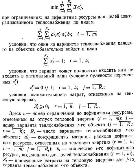 ПРОИЗВОДСТВЕННЫЕ МОДЕЛИ ОПТИМАЛЬНОГО ОТРАСЛЕВОГО ПЛАНИРОВАНИЯ ТЕПЛОСНАБЖЕНИЯРассмотрим отраслевую оптимизационную модель перспективного проектирования централизованного теплоснабжения [84]. Она представляет собой задачу развития и размещения предприятий подотрасли «Теплоснабжение» отрасли «Электроэнергетика» и является составной частью системы взаимосвязанных перспективных и текущих планов — основных направлений экономического и социального развития СССР на 10 лет, пятилетнего и годовых планов [34]. В перспективном планировании развития различных отраслей народного хозяйства СССР широко применяются экономико-математические методы и электронно-вычислительная техника. В частности, в состав отраслевой автоматизированной системы управления Минэнерго СССР (ОАСУ «Энергия») входят подсистемы «Перспективное развитие отрасли» и «Технико-экономическое планирование», предназначенные для решения задач оптимального развития электроэнергетики и представляющие собой комплекс непрерывных и дискретных математических моделей. Этот комплекс включает линейную непрерывную модель оптимизации ТЭК на верхнем уровне и дискретные отраслевые модели развития электроэнергетики. Между этими моделями происходит итеративный обмен информацией вплоть до сходимости процесса оптимизационных расчетов. Необходимость дополнения непрерывной модели оптимизации ТЭК отраслевыми дискретными моделями настоятельно подчеркивается в работе [26]. Что касается централизованного теплоснабжения, то эта подотрасль энергетики лишь относительно недавно включена в линейную оптимизационную модель ТЭК при долгосрочном планировании (на срок 15 лет и более) в виде блока теплоснабжения, разработанного в Сибирском энергетическом институте Сибирского отделения АН СССР (СЭИ СО АН СССР) [67]. Учет указанного блока оптимизационной модели ТЭК позволяет определять оптимальные маштабы развития теплофикации и централизованного теплоснабжения на отдаленную перспективу, а также ориентировочную потребность теплоснабжающей отрасли в дефицитных ресурсах (трудовых ресурсах, топливе по видам, капиталовложениях, энергетических мощностях ТЭЦ, трубопроводах для тепловых сетей, металле, цементе, сборном железобетоне и др.). Определенная с помощью оптимизационной модели ТЭК структура источников централизованного теплоснабжения нуждается в дальнейшей детализации в виде рекомендаций относительно конкретных объектов, по которым разрабатываются схемы теплоснабжения. При переходе от обобщенных решений, полученных с помощью блока теплоснабжения оптимизационной модели ТЭК, к конкретным рекомендациям по отдельным объектам предлагается ранжирование объектов по максимум экономии приведенных затрат за счет теплофикации по сравнению с раздельной схемой энергоснабжения на единицу капиталовложений в комбинированную схему, определенному из локальных объектных расчетов нижнего уровня иерархии [67]. Таким образом, предполагается двухуровневая система моделей (ТЭК — объект) и непосредственно учитывается ограничение лишь на один вид дефицитных ресурсов — капиталовложения. Очевидно, что учет дискретности оборудования и других ограничений может существенно повлиять на результаты окончательных выводов по конкретным объектам. При существующей практике расс