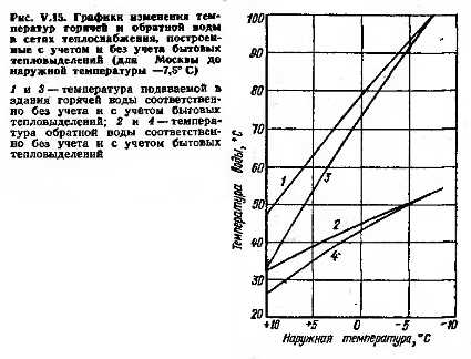Экономия тепла за счет ведения эксплуатации отопления по наиболее экономичному режимуСовершенствование режима эксплуатации отопления может также дать экономию тепла. Такое совершенствование можно проводить без существенных единовременных затрат. Так, например, перегревы отапливаемых помещений в теплый период отопительного сезона, о которых говорилось в предыдущем пункте, могут устраняться не только автоматизацией подачи тепла, но и периодическим отключением систем отопления вручную [35], более частым и длительным при наружных температурах, близких к 8—10° С, и более коротким и редким в начале срезки графика температур горячей воды в системе централизованного теплоснабжения. Эти срезки в зависимости от климатических и некоторых других условий начинаются при наружных температурах от минус 3° С до 2—3° С тепла. Конкретизация режима такого периодического отключения должна производиться в каждом случае (для каждой системы теплоснабжения или ее частей) отдельно с учетом местных условий, включая и условия эксплуатации. При применении квартирного отопления, присоединенного к централизованному теплоснабжению, необходимое уменьшение подачн тепла в связи с повышенными параметрами теплоносителя в наружных сетях может производиться самими жильцами с помощью клапанов, установленных на тепловом вводе в квартиру (см. стр. 52—62). Врачами-гигненистами установлено, что для человека полезно снижение температуры в жилых домах в ночное время на 2—2,5° С. Такой режим отопления жилых помещений, наряду с пользой для здоровья жильцов, также может дать некоторую экономию тепла. При квартирном отоплении как с генераторами тепла в квартирах, так и При присоединении зданий к централизованному теплоснабжению, этот режим может поддерживаться самими жильцами. При централизованном теплоснабжении существенную роль в ведении наиболее экономичного режима эксплуатацин отопления зданий может сыграть объединен-" ная диспетчерская служба, распространяющаяся в последнее время в ряде крупных городов. Все системы централизованного теплоснабжения работают сейчас по графику изменения температур горячей и обратной воды, который строится в зависимости от изменения наружных температур без учета бытовых тепловыделений. Между тем они есть и составляют 10—15% теплопотерь — при расчетной наружной температуре и 25—35% — При средней температуре отопительного периода. Эти тепловыделения оказываются равными тепло- потерям помещений при наружной температуре 8—10° С, в связи с чем При этих температурах жилые здания не нуждаются в отоплении. Подача тепла в жилые здания с учетом имеющихся в них тепловыделений, по данным исследователей, позволит уменьшить его расход на 10—15% общего годового расхода тепла на отопление. Такой режим отопления может быть обеспечен изменением графика температур воды в теплосетях с учетом имеющихся бытовых тепловыделений (рис. V.15). Возможность и целесообразность перехода на новый график была подтверждена исследованиями МНИИТЭП, проводящимися с 1975 г. в реальных условиях эксплуатации систем теплоснабжения двух кварталов на 1200—1300 квартир. При квартирных системах отопления, присоединенных к централизованному теплоснабжению, регулировка подачи тепла в соответствии с бытовыми тепловыделениями может производиться самими жильцам