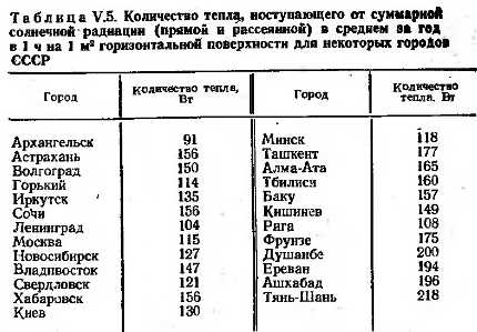Об экономии топлива за счет использования бестопливных источников энергии и вторичных энергоресурсовНа современном этапе развития техники в качестве бестопливных источников энергии, которые могут использоваться для теплоснабжения зданий, целесообразно рассматривать: солнце, геотермальные воды и находящийся на большой глубине под землей твердый массив, имеющий достаточно высокую температуру. При использовании этих источников тепла, а также вторичных энергоресурсов (БЭР) не только уменьшается расход топлива, но и не загрязняется окружающая среда, исключается тяжелый труд шахтеров и кочегаров, не требуется транспорт для перевозки топлива и золы. Особенно перспективно использование бестопливных источников тепла и БЭР в районах, удаленных от мест добычи топлива. Наиболее привлекательным является использование тепла неиссякаемой солнечной энергии. За одни год на нашу планету поступает в 10 раз больше этой энергии по сравнению с энергией, заключенной во всех видах ископаемого топлива [28]. Во многих странах уже имеется опыт использования для теплоснабжения зданий солнечной энергии. Особенно широкое распространение солнечные подогреватели воды для бытового горячего водоснабжения малой мощности получили в Индии, Японии, США, южных районах СССР и других странах. Такие установки (см. п. 1.9, стр. 79—81) с дублированным электроподогревом, дающие экономию тепла до 70—80%, достаточно хорошо проверены в эксплуатации и их целесообразно широко применять в малоэтажной жилой застройке как в южных районах страны, так и в северных— для летнего пользования. При этом, конечно, следует учитывать число часов солнечного сияния в районе применения солнечных теплопрнемннков. Данные о количестве поступающего тепла для некоторых городов СССР с учетом интенсивности солнечной радиации в зависимости от широты, на которой расположен город, и средней продолжительности солнечного сияния приведены в ![]() Как видно из табл. V.5, количество тепла, поступающего от солнечной радиации, колеблется от 91 до 218 Вт/м2. Теплопоступления для каждого города существенно меняются по месяцам, достигая в мае — июле максимума, превышающего теплопоступления в декабре — январе; например, для Свердловска в 10—13 раз, а для Владивостока — в 2—2,5 раза. Если принять КПД установки, поглощающей солнечную энергию и передающей ее для теплоснабжения здания, равным 30%, то с 1 м2 площади теплопоглощающих элементов в течение года можно полезно использовать, например, в Душанбе до 17 500 кВт. Сравнивая эту величину с годовыми теплопотеряМи одноквартирного дома полезной площадью 50 м2 (7500 кВт), можно видеть, что использование для отопления даже небольшой части этой энергии представляет значительный интерес, тем более, что в летнне месяцы получаемая от солнца энергия может использоваться для охлаждения здания. При применении солнечных подогревателей воды малой мощности размещение хорошо облучаемых солнцем теплоприемников на крыше зданий или на поверхности земли обычно не вызывает существенных трудностей. Вместе с тем при повышении мощности установки требуются большие площади для размещения теплопри еминков и появляются некоторые трудности при их Эксплуатации. Поэтому сооружение таийх установок пока целесообразно вестн в порядке экспериментального строительства. Установки по испо