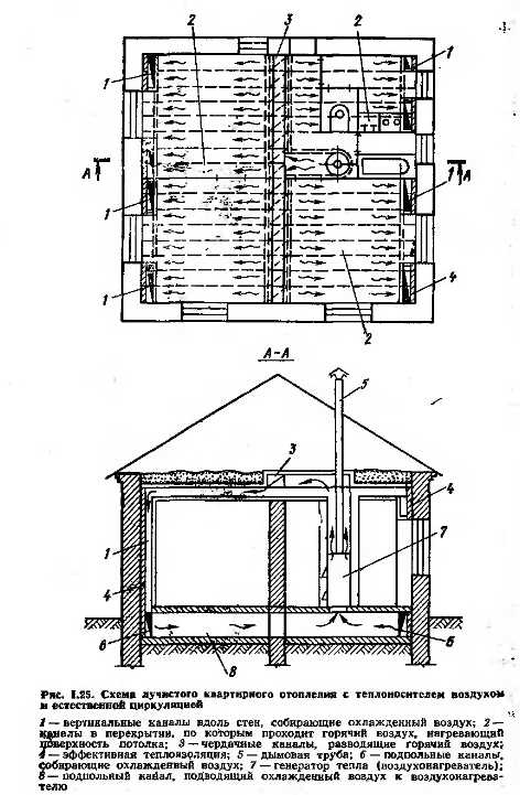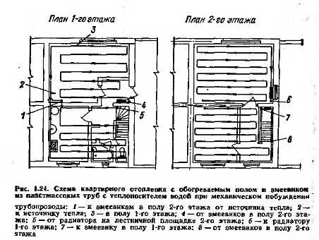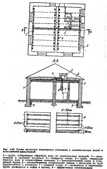 Применение в квартирном отоплении лучистых и панельных системПри лучистом отоллении тепло в помещение передается преимущественно излучением через отопительные панели в потолке, при панельном —от нагревательных плоских поверхностей отопительных панелей, располагаемых в стенах, перегородках и в полу (отопление греющим полом). Для жилых помещений средние температуры греющих поверхностей, °С, ограничиваются [13] следующими значениями: ![]() В качестве теплоносителя, нагревающего теплоотдающие поверхности, в жилых домах целесообразно применять горячую воду и воздух, температуру которых можно менять в зависимости от температуры наружного воздуха и других факторов, определяющих тепловой баланс отапливаемых помещений (бытовые тепловыделения, солнечная радиация и т. п.). При расположении отопительных панелей в потолке применяют системы с естественной циркуляцией. В других случаях, а также при отсутствии подвала, где можно было бы разместить генератор тепла, как правило, применяют системы с механическим побуждением. В отечественной практике лучистое и панельное отопление для малоэтажных зданий не нашло широкого применения. Однако вследствие высоких санитарно-гигиенических и эстетических качеств и некоторых других преимуществ, например удачных конструктивных решений, когда элементы системы отопления совмещаются с конструкциями отапливаемого здания, лучистые и панельные системы для квартирного отопления могут представить определенный интерес. ![]() На рис. 1.23 представлена схема лучистого квартирного отопления с теплоносителем водой и естественной циркуляцией. Основным элементом в этой системе отопления являются железобетонные плиты перекрытия, в которые При изготовлении заложен регистр из стальных труб диаметром 20 мм (предварительно опрессованный повышенным давлением). Змеевик, который обычно используют в системах лучистого отопления, в данном случае (при естественной циркуляции) применить нельзя из-за его большого гидравлического сопротивления. При применении горизонтальных отопительных панелей с регистрами очень важно надежно удалять из них воздух. С этой целью регистр в панель перекрытия укладывают с уклоном не менее 0,003, в рассматриваемом случае (длина регистра около 4 м при толщине панели перекрытия 150 мм) этот уклон составляет 0,004. Стальные трубы отопления, закладываемые в железобетонную плиту, в определенной степени могут выполнять функции распределительной и рабочей арматуры. Для уменьшения потерь тепла через отопительные панели утепление чердачного перекрытия должно быть повышенным. При расположении отопительных панелей в чердачном перекрытие расширительный сосуд размещают на чердаке с теплоизоляцией внешней поверхности или в утепленной будке. Присоединяют его к трубопроводу в данном случае так же, как в системах центрального отопления. Схема лучистой системы отопления теплоносителем водой с естественной циркуляцией, представленная на рис. 1.23, достаточно проста как в сооружении, так и в эксплуатации, поэтому есть все основания для применения ее в отечественном малоэтажном жилищном строительстве. Железобетонные плиты перекрытий имеют достаточную теплоаккумулирующую способность, что позволяет осуществлять топку этой системы с определенными перерывами. Поэтому эта система, как и система в