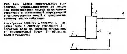 Присоединение существующих систем квартирного отопления с генераторами тепла к централизованному теплоснабжениюСистемы квартирного отопления, присоединенные к централизованному теплоснабжению, удобнее систем квартирного отопления с генератором тепла, поскольку отпадает необходимость топки. Кроме того, при централизованном теплоснабжении существенно уменьшается расход топлива на выработку тепла и возможно использование топлива любых сортов; при использовании твердого и жидкого топлива можно предусматривать очистку уходящих газов для предотвращения загрязнения воздушного бассейна. Поэтому целесообразно использовать возможность присоединения существующих систем квартирного отопления с генераторами тепла к централизованному теплоснабжению. В тех случаях, когда сроки существования системы отопления близки к амортизационным и оборудование находится в ветхом состоянии, следует устраивать новую систему (см. п. 1.7). Если же оборудование существующей системы отопления еще работоспособно и само здание, где она устроена, реконструкции не подвергается, то такие системы можно присоединять к централизованному теплоснабжению без существенных переделок Наиболее просто это присоединение осуществляете в тех случаях, когда теплоносителем в системе тепло снабжения и существующей системе квартирного отопления является вода. При этом достаточно генератор тепла заменить водоводяным теплообменником, рассчитанным на постоянную работу и возмещение теплопотери квартиры при расчетной наружной температуре. В сис темах, которые были рассчитаны на топку с перерыва ми, например водяные с увеличенной емкостью, такой режим работы приведет к тому, что отопительные При боры будут работать с пониженной, но достаточной дл возмещения теплопотерь температурой. В системах с естественной циркуляцией важно, чтоб теплообменник для циркулирующей воды не создавала большого гидравлического сопротивления. Такими теплообменниками являются теплообменники со спиралеобразным змеевиком. В них сетевая вода с большой скоростью проходит по трубкам, а подогреваемая — с малой скоростью в межтрубном пространстве, в следствии чего обеспечивается небольшое гидравлическое сопротивление теплообменника При коэффициенте теплопередачи змеевика, равном 550—800 Вт/(м2-°С). В системах, где теплоноситель вода перемещается с помощью насоса, генераторы тепла заменяют теплообменниками (например, скоростными противоточиыми), в которых вода также имеет повышенную скорость движения, равную 1—1,5 м/с. При этом существенно увеличивается коэффициент теплопередачи змеевика, что позволяет уменьшить площадь поверхности его нагрева и размеры самого теплообменника.. Использование описанного выше так называемого независимого присоединения квартирного отопления к централизованному теплоснабжению целесообразно, когда система квартирного отопления может не выдержать более высокого давления, которое бывает в наружных сетях централизованного теплоснабжения, или когда из этих сетей производится непосредственный водоразбор на горячее водоснабжение. Это обусловлено тем, что в емкостях отопительных систем, особенно если они увеличены (см. п. 1.1), могут происходить изофильные и термофильные бактериальные процессы, которые будут ухудшать качество идущей на водор