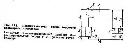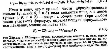 Расчет водяного квартирного отопления с естественной циркуляцией и конструктивно определяемой (нормальной) емкостью системыОсобенности расчета отопительных приборов и трубопроводов определяются действующим в системе незначительным циркуляционным давлением, обусловленным главным образом охлаждением воды в трубах. На рис. II.1 показана принципиальная схема системы водяного квартирного отопления. Основное отличие этой системы от обычной системы домового центрального водяного отопления с естественной циркуляцией состоит в том, что у последней, как правило, котел заглублен по сравнению с полом отапливаемых помещений и установлен обычно в подвальном этаже. Подогреваемая в котле вода перемещается по трубопроводу в нагревательные приборы и отдает свое тепло отапливаемым помещениям, охлаждаясь, она вновь поступает по трубопроводу в котел; в нем вода вновь подогревается, и цикл повторяется. Для обеспечения нужной температуры в отапливаемых помещениях необходимо, чтобы теплоотдача установленных в них отопительных приборов и труб системы отопления соответствовала теплопотерям помещения, а теплопроизводительность генератора тепла была бы не меньше теплопотерь. Вода по трубопроводам от котла к приборам и обратно движется вследствие разности плотности охлажденной (более тяжелой) и горячей (более легкой) воды. ![]() Для определения давления, заставляющего перемещаться воду по замкнутому циркуляционному кольцу, изображенному на рис. ИЛ, разделим мысленно это кольцо сеченнем А—А на две части. Очевидно, что, несмотря на одинаковую высоту, давление столба воды в правой части будет больше, чем давление столба воды в левой, так как в последней вода имеет более высокую температуру. Разность давлений между столбами воды и создает циркуляционное давление, которое заставляет воду двигаться от котла к приборам и обратно. Если в соответствии с имеющейся на рисунке нумерацией отдельных участков труб и элементов системы отопления мы обозначим их высоты и среднюю плотность проходящей по ним воды буквами h и р, то циркуляционное давление Нд, Па будет определяться выражением ![]() При этом предполагается, что Sft в первом и втором произведении равны. Следует, однако, иметь в виду, что если теплопроизводительность генератора тепла превышает максимальную теплоотдачу отопительной системы, то в ней может происходить вскипание воды, что и наблюдается иногда на практике. Этот недостаток систем водяного квартирного отопления будет устраняться при увеличении емкости системы отопления и, в частности, расширительного сосуда. Трудоемкость гидравлического и теплового расчета систем квартирного отопления может быть существенно уменьшена при применении вычислительных машин. Расчет генераторов тепла водяного квартирного отопления дается в гл. IV. |