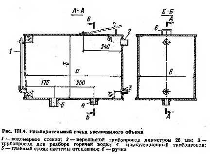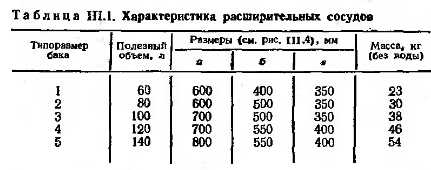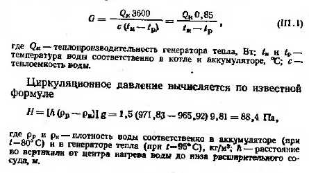 Совмещенная система квартирного отопления и горячего водоснабжения с непосредственным подогревом воды в генераторе тепла и с расширительным сосудом увеличенной емкостиОдин из вариантов совмещенной системы водяного квартирного отопления и горячего водоснабжения с непосредственным подогревом воды в генераторе тепла представлен на рис. III.3. В этой системе расширительный сосуд одиовременно выполняет функции аккумулятора горячей воды. Если горячее водоснабжение не работает, то в отопительной системе происходит нормальная циркуляция. Горячая вода от генератора тепла поступает по главному стояку в разводящий горячий трубопровод, из него разводится по отопительным приборам, поступает в сборный, обратный трубопровод и через открытый вентиль 13 направляется обратно в генератор тепла. Система питается водой через питательный бачок с шаровым клапаном и питательную линию путем открывания вентиля 10. Спуск воды из системы производится .через спускную линию. Если горячее водосиабжеиие не работает, вентиль 14 на циркуляционной перемычке, соединяющей расширительный сосуд с обратной линией, должен быть закрыт. При работе горячего водоснабжения циркуляция в системе отопления может быть прекращена путем закрывания вентиля 13. Горячая вода из расширительного сосуда (ои же аккумулятор горячей воды) через линию 7 поступает к потребителю. Для пополнения расширительного сосуда подогретой водой водопроводный вентиль 10 должен быть открыт. При этом вода поступает в питательный бачок с шаровым клапаном, попадает по питательной линии в генератор тепла, в нем подогревается и по главному стояку пойдет в расширительный сосуд. Бачок с шаровым клапаном предиазиачеи для автоматического пополнения расширительного сосуда по мере расходования воды. Одиако установка питательного бачка необязательна; при отсутствии его схема несколько упростится, ио зато придется следить за уровнем воды в расширительном сосуде. Тепло производительность генератора тепла, рассчитываемого на возмещение теплопотерь помещений, может оказаться недостаточной для удовлетворения максимальной потребности тепла на горячее водоснабжение (например, при заполнении ванны). Поэтому необходимо иметь определенную емкость для предварительного подогрева горячей воды; такая емкость, как уже было сказано, находится в расширительном сосуде. При отсутствий водоразбора для предварительного подогрева воды в расширительном сосуде его соединяют с генератором .тепла не только главным стояком, ио и циркуляционной перемычкой, которую в случае необходимости включают, открывая на ней вентиль. Разборная линия горячего водоснабжения присоединена к расширительному сосуду на определенном расстоянии (10—15 см) от его, с тем чтобы при большом водоразборе расширительный сосуд полностью не опорожнялся. Для спуска воды из расширительного сосуда предусмотрена труба 6 с вентилем. Во избежание переполнения расширительного сосуда и питательного бачка водой (что возможно при неисправности шарового клапана или при наполнении расширительного сосуда холодной водой и последующем ее нагревании без разбора воды) их необходимо снабжать переливными трубами, выводимыми в кухонную раковину. Одновременно эти трубы выполняют функции воздушных трубок. ![]() Если в здании отсутствует водопровод, то р