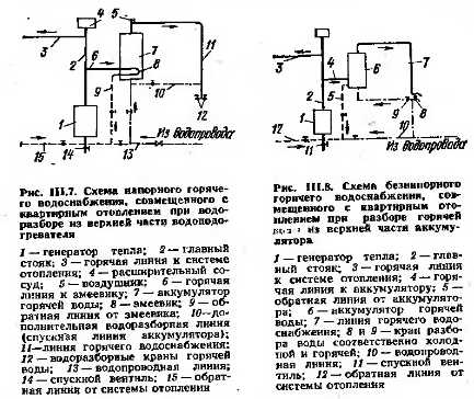 Совмещенная система квартирного отопления и горячего водоснабжения с водоразбором горячей воды1 из верхней части аккумулятораВ рассмотренных выше системах горячего водоснабжения аккумуляторы горячей воды являются без- напорными, при этом разбор воды осуществляется из их нижией части. При таком присоединении аккумулятора горячей воды к водопроводным линиям имеется свое преимущество— работа системы допускается при небольшом заполнении аккумулятора водой. В условиях квартирного горячего водоснабжения это часто Может оказаться удобным, например, при необходимости быстрого получения небольшого количества горячей воды. Однако такие системы обладают одним существенным недостатком: при пополнении аккумулятора холодной водой, последняя, смешиваясь с имеющейся горячей водой, охлаждает ее, вследствие чего к водоразборным кранам после пополнения аккумулятора поступает вода пониженной температуры. Кроме того, при быстром заполнении аккумулятора холодной водой может установиться заметная неравномерность температур воды по высоте аккумулятора, горячие слои поднимутся вверх, не смешиваясь с нижними холодными слоями. При этом, несмотря на наличие в аккумуляторе некоторого количества горячей воды, к водоразборным кранам будет поступать холодная вода до тех пор, пока не прогреется ведь аккумулятор. Поэтому представляет интерес система горячего водоснабжения с водоразбором из верхней части аккумулятора. Она применима лишь при условии присоединения аккумулятора к водопроводной линии. На рис III. 7 показана система горячего водоснабжения с аккумулятором, находящимся под давлением водопровода. Эта система предусматривает подогрев воды в аккумуляторе через змеевик Оез передачи водопроводного давления на систему отопления. Холодная вода из водопровода поступает в нижнюю часть аккумулятора, подогревается змеевиком и из верхней части аккумулятора идет в водоразборные краны. Аккумулятор горячей воды всегда заполнен водой доверху, причем наиболее горячая вода находится в верхней его части, откуда и происходит водоразбор. Новые порции поступающей холодной воды не смешиваются с имеющейся в аккумуляторе горячей водой, особенно При вытянутом по высоте аккумуляторе. Возможность использовать весь запас горячей воды в аккумуляторе без заметного понижения температуры отбираемой воды при одновременном пополнении аккумулятора холодной водой является одним из преимуществ рассматриваемой системы. Другое преимущество заключается в простоте эксплуатации, так как При работе такой системы не приходится следить за уровнем воды в аккумуляторе. К недостаткам системы следует отнести невозможность расходования горячей воды при неполном аккумуляторе, а также при отсутствии давления в водопроводе. Однако эти недостатки можно устранить, если присоединить водоразборную линию не только к верхней, но и к нижней части аккумулятора (линия 10 на рис. 1II.7). ![]() При водоразборе из верхней части аккумулятора вентиль 14 на линии должен быть закрыт. Если же надо подогреть неполный аккумулятор, то он заполняется водой лишь в требуемом объеме и подогревается только это уменьшенное количество воды, которая поступает к водоразборным кранам по линии 10. Эта же линия является спускной на случай опорожнения аккумулятора. При этом вентиль на трубопро
