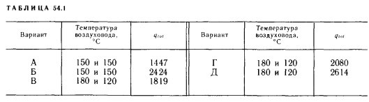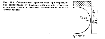 Данные о теплопроизводительности систем лучистого отопления, в которых в качестве теплоносителя используется воздухСуществуют различные методы расчета систем воздушного лучистого отопления, что связано прежде всего с их конструктивными различиями. В качестве примера рассмотрим решение с двумя воздуховодами — подающим и обратным — диаметром по 300 мм (см. рис. 9.9). Количество теплоты, отдаваемой вниз, вычисляют таким же образом, как и для отопительных экранов, но с тем отличием, что среднюю избыточную температуру греющей поверхности нужно принимать во внимание с учетом температуры теплоносителя и величины a.k¦ Отдельно при расчетах рассматривают теплоотдачу через боковые экраны (рис. 54.1). При этом лучистую и конвективную теплоотдачу следует учитывать, принимая во внимание тепловой баланс ![]() Вычисления до некоторой степени имеют итерационный характер, поскольку среднюю температуру боковых экранов надо принимать заранее, чтобы выполнялось условие теплового баланса. Третий компонент теплоотдачи, теплоотдачу через теплоизоляцию (вверх) вычисляют рассмотренным ранее способом. Для сравнения отдельные компоненты теплоотдачи определяются для следующих вариантов: А — двухпроводная система, температура воздуховодов с подающим и обратным теплоносителем 150°С; ![]() Б — трехпроводная система, температура воздуховодов с подающим и обратным теплоносителем 150°С; В — двухпроводная система, температура воздуховода с подающим теплоносителем 180°С, с обратным 120°С; Г — трехпроводная система, температура воздуховода с подающим теплоносителем 180°С, с обратным 120°С (температура среднего воздуховода 180°С); Д — четырехпроводная система, температура воздуховода с подающим теплоносителем 180°С, с обратным 120°С (температура двух средних воздуховодов 180°С). Здесь температура боковых экранов при температуре воздуховодов 150°С равна 80°С, при температуре воздуховода 180°С— 100°С, а при температуре воздуховода 120°С—65°С. Значения полной теплоотдачи экрана qtot, Вт/м на 1 м отопительных экранов, соответствующих этим конструкциям, даны в табл. 54.1. ![]() Следует заметить, что для боковых экранов в расчет принимали теплоотдачу только наружной поверхности, поскольку внутреннюю поверхность экранирует отопительная труба. |