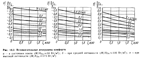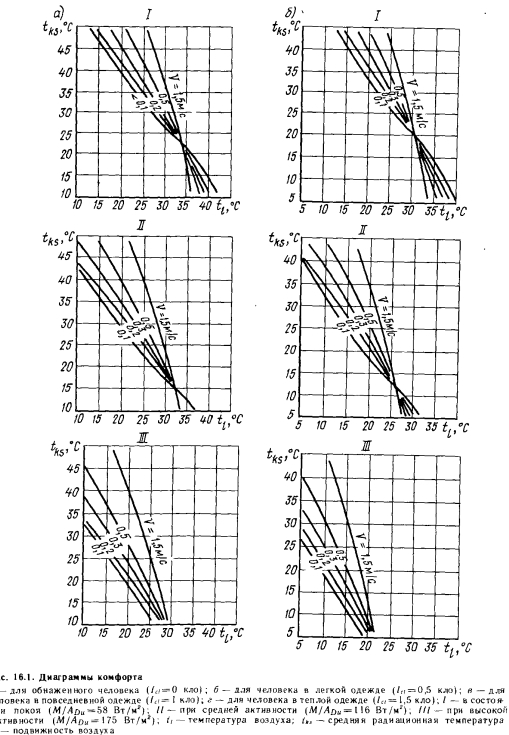 ДИАГРАММЫ КОМФОРТАПри лучистом отоплении используют 28 диаграмм комфорта, которые можно разбить на три группы: к первой группе относятся 12 диаграмм, построенных при различных значениях относительной влажности и подвижности воздуха, но при температуре воздуха, равной средней радиационной; во вторую группу входят 4 диаграммы, построенные при одинаковой температуре воздуха и средней радиационной температуре, но при различной подвижности воздуха; ![]() к третьей группе относятся диаграммы, построенные при различных значениях подвижности и температуры воздуха, а также средней радиационной температуры. Последняя группа диаграмм, построенных при относительной влажности 50%, чаще всего используется при рассмотрении лучистого отопления. ![]() На рис. 16.1 представлены диаграммы комфорта для различных видов одежды и трех степеней активности человека. К диаграммам комфорта относятся еще и так называемые вспомогательные диаграммы (рис. 16.2), которые отражают изменение температуры воздуха ti и средней радиационной температуры tks в зависимости от термического сопротивления одежды и подвижности воздуха для трех степеней активности человека. Эта диаграмма построена при относительной влажности 50% и показывает, насколько следует снижать температуру воздуха для обеспечения комфортных условий, если средняя радиационная температура поднимается на 1°С. ![]() Комфортную температуру, вызывающую приятное теплоощущение, можно определить также по диаграммам первой и второй группы, где средняя радиационная температура и температура воздуха одинаковы. В этом случае используют зависимость ![]() С диаграммами комфорта и принципами расчета по Фангеру тесно связаны такие параметры, как PMV (ожидаемая величина теплоощущения) и PPD (ожидаемый процент вероятности неблагоприятного теплоощущения) [69, 36]. Об этих показателях речь будет идти ниже. |