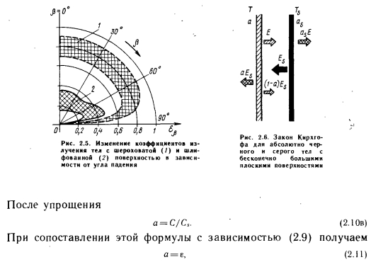 Излучение реальных телОписанный Планком закон распределения дает максимальное значение излучаемой энергии при любых температуре и длине волны. Большую энергию тело не может испускать ни на отдельных длинах волн, ни в отдельных диапазонах. В действительности встречаются такие тела, которые при всех длинах волн и температурах испускают определенную долю энергии, излучаемой черным телом (рис. 2.4). Их называют серыми телами. Существуют и такие вещества, которые испускают излучение не на всех длинах волн, а в некоторых областях могут достигать волны излучения черного тела. Излучение таких тел называется избирательным (селективным). К ним относятся электрические проводники, а также газы. Твердые тела, используемые в отопительной технике, с достаточным приближением можно считать «серыми». Применение законов черного тела к серым телам. Излучение Е серого тела, согласно сказанному выше, можно учитывать как независимую от длины волны постоянную долю излучения черного тела с одинаковой температурой. Эту долю определяют по формуле и называют коэффициентом излучения или относительной способностью к излучению, а испускаемую энергию — излучательной способностью серого тела, или излучением. Коэффициент е определяют экспериментально. ![]() Распределение излучения реальных тел в зависимости от различных углов падения описывается законом косинуса Ламберта не совсем точно. Для них коэффициент излучения е является средним значением коэффициентов ер, соответствующих отдельным направлениям. На рис. 2.5 показано изменение коэффициентов излучения тел с шероховатой и отполированной поверхностью в зависимости от угла падения р. Для шероховатых тел едаер=0, а для гладких тел еда 1,2ер = о. Как для шероховатых, так и для гладких тел при изменении Р от 75 до 90° коэффициент излучения резко уменьшается. При некоторых условиях это очень выгодно с точки зрения отопительной техники. Например, доля теплоты, излучаемой потолочными устройствами лучистого отопления на участки, расположенные вне зоны нахождения людей (на наружные стены, окна), меньше, чем доля, приходящаяся на пол. Закон Кирхгофа. Приведенные выше зависимости описывают явления, связанные с излучением и поглощением тел, обособленно друг от друга. Закон Кирхгофа определяет соотношение между ними. Представим себе отдельные абсолютно черное и серое тела с бесконечно большой плоской поверхностью, расположенные так близко друг к другу, чтобы они взаимооблучались (рис. 2.6). Из излучения Es абсолютно черного тела серое тело поглощает часть aEs и отражает часть (1—a)Es. Таким образом, действительное излучение серого тела равно Е +(1 —a)Es. Его полностью поглощает абсолютно черное тело. ![]() При сопоставлении этой формулы с зависимостью (2.9) получаем ![]() т. е., согласно закону Кирхгофа, поглощательная и излучательная способности серого тела равны. Это действительно для любой области длин волн. |