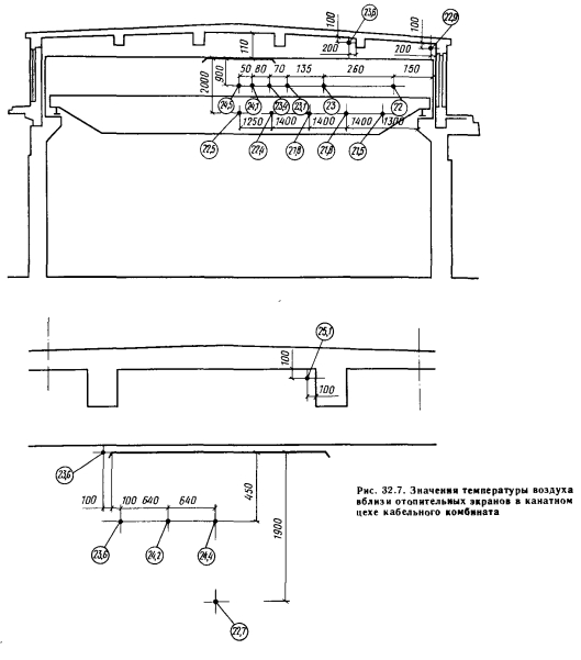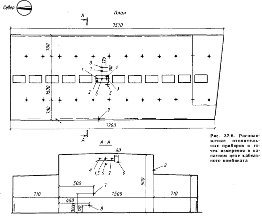 Канатный цех кабельного комбинатаПлан канатного цеха кабельного комбината, а также расположение отопительных приборов и точек измерения даны на рис. 32.6. Помещение имеет смешанное отопление, в среднем пролете — лучистое с помощью отопительных экранов, а в двух боковых — с помощью регистров из гладких труб. Размер отопительных экранов 2800X4600 мм, расстояние до резьбы отопительных труб 300 мм, теплоизоляцией отопительных экранов служит стекловата слоем толщиной 5 см. Теплоносителем для обоих видов отопительных приборов является горячая вода, которую получают в противоточных теплообменниках, подключенных к теплофикационной сети Будапештской ТЭЦ. Режим работы непрерывный. В период работы обеих систем отопления (1—8 февраля) были проведены первые замеры на местах. На точность измерений влияла и теплоотдача время от времени работавших в помещении электродвигателей (6—7 двигателей мощностью по 24—28 кВт). Замеры также производились регистрирующими термогигрографами. За время проведения измерений снижение температуры греющей воды обычно колебалось в пределах 15—18° С. ![]() Из полученных термограмм изменения температуры можно сделать следующие выводы: а) под действием регистров из гладких труб, находящихся у стены, и в меньшей степени — за счет внутренних теплопоступлений между рабочей зоной и покрытием здания при высоте последнего 9 м возникает температурный перепад 4--5°С. б) влияние теплоаккумуляции пола не поддается оценке из-за непрерывной работы отопительной системы; в) вблизи отопительных экранов температура воздуха возрастает в меньшей степени из-за наличия смешанной системы отопления; г) влияние холодных наружных стен, естественно, сказывается и при использовании смешанной системы отопления. ![]() Для контроля измерений, осуществляемых с помощью приборов, а также для исследования температурных зон, формирующихся около отопительных экранов, позднее были произведены замеры ртутными термометрами. Регистры из гладких труб были отключены в тот день с утра и до окончания измерений (до 17 ч). Работали только отопительные экраны со средней температурой греющей воды около 63°С. За период измерений (от 12 до 17 ч) работали только 1—2 машины, т. е. внутренние теплопоступления были минимальны. Некоторые данные этих измерений приведены на рис. 32.7. При оценке результатов последних измерений нужно принимать во внимание, что хотя обычное отопление уже 5—6 ч не работало, на результаты измерений сильно влияла теплоаккумуляция пола и стен. Измерения показали, что при применении смешанной системы отопления приходится учитывать значительно более высокой температурный градиент и более неравномерное распределение температуры, чем при лучистом отоплении. |