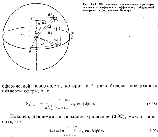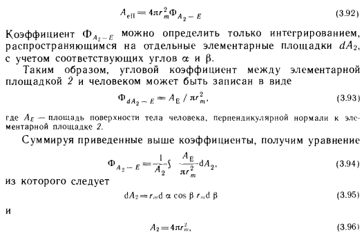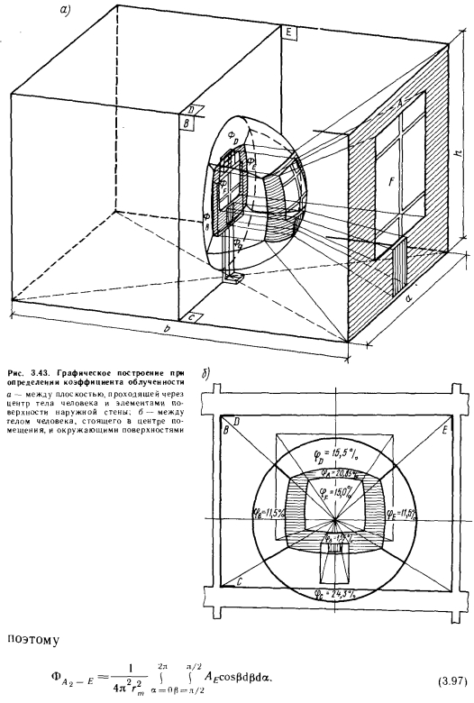 Коэффициент эффективно облучаемой поверхностиВначале предположим, что человек сидит в центре сферы (рис. 3.44). Принцип расчета здесь такой же, как и в описанных выше методах расчета лучистого теплообмена, поэтому изложим только его суть. На основании рис. 3.44 можно записать следующее уравнение: ![]() Этот угловой коэффициент представляет собой коэффициент облученности, который, однако, относится не к половине, а ко всей поверхности сферы. Именно для того, чтобы различать эти понятия, для полусферы применяют термин «коэффициент облученности», а для сферической поверхности — «угловой коэффициент». Поскольку угловой коэффициент ФЕА2 определяет ту долю излучения, идущего от тела человека, которая доходит до поверхности 2, его считают равным единице. Поэтому уравнение (3.91) можно записать в следующем виде: ![]() ![]() ![]() Значения Ам были определены Фангером для очень большого числа людей с учетом четырех комбинаций положений и одежды. Кроме того, он вычислил 78 различных угловых коэффициентов. На основании результатов экспериментов, проведенных с обнаженными людьми, он определил коэффициент эффективно облучаемой поверхности, пользуясь формулой ![]() Численные значения этого коэффициента, полученные Фангером в результате проведения многочисленных экспериментов, вместе со значениями приведены в указанных выше работах. |