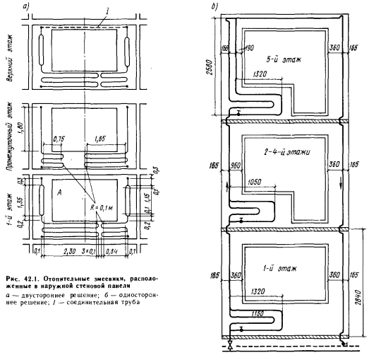КОНСТРУКТИВНОЕ УСТРОЙСТВО СИСТЕМЫ ОТОПЛЕНИЯ, РАСПОЛОЖЕННОЙ В НАРУЖНОЙ СТЕНОВОЙ ПАНЕЛИДля размещения труб системы отопления в наружной стеновой панели существует много способов. На рис. 42.1 показаны два вида устройств, применяемых в Венгрии, с указанием основных размеров (см. также рис. 6.11). Недостаток устройства системы отопления в потолке или наружной стене состоит в том, что это затрудняет технологию монтажа панели. Ниже даются краткие сведения об изготовлении панелей и их монтаже. При подготовке форм для изготовления панелей нужно учитывать, где располагается слой бетона для размещения отопительных труб — в нижней части формы или в верхней. В стеновой панели отопительная труба всегда располагается в бетонном слое, обращенном к помещению, по возможности вблизи плоскости внутренней стены, с учетом покрывающего бетонного слоя толщиной минимум 3 см. Применяют и такое решение, при котором отопительная труба расположена в центре тонкой однослойной перегородки и служит для дополнительного обогрева обоих помещений. В том случае, когда наружный бетонный слой панели при изготовлении расположен вверху, отопительную трубу и отводы от нее целесообразно крепить к днищу формы, а в некоторых случаях — к боковы-м частям опалубки. Если же наружный слой при изготовлении расположен внизу, фиксацию отопительной трубы можно обеспечить с помощью прокладок, установленных на теплоизоляционную плиту, а для предупреждения всплывания во время вибрации трубы следует прикрепить к арматуре наружного бетонного слоя перевязочной проволокой. Выводы отопительных труб во всех случаях целесообразно крепить к боковым частям опалубки таким образом, чтобы плоскость наружного примыкания оставалась параллельной плоскости бетона внутри него, обеспечивая возможность Механизированного заглаживания бетона. ![]() Для проектирования вкладышей форм, необходимых для отопительных труб и выводов, нужны рабочие проекты панелей, проекты стального каркаса панелей и рабочие проекты отопительных труб. Надо также знать технологию изготовления стеновой панели и последовательность рабочих операций. Четыре точки примыкания отопительной трубы на поддоне формы должны по проекту предусматриваться на одних и тех же местах, с коническим вкладышем, фиксирующим место трубы, с точностью до ±1 мм и максимальными допусками, учитывая возможность легкой распалубки затвердевшей панели. Закладными деталями формы являются крепежные элементы из стали или пластмассы, крепление кото- рых к форме целесообразно выполнять с помощью болтов. В других средствах для крепления отопительных труб в ходе изготовления панели нет необходимости. При применении отопительных панелей технологическая последовательность их сборки не изменяется: снятие с подъемного крана, подпорка элементов, нивелирование, сварка стальных соединительных элементов, снятие подпорных стержней, изготовление опалубки для узловых соединений, их бетонирование. Только после выполнения этих работ можно производить соединение отопительных труб. Последнее осуществляют с помощью соответствующих соединительных элементов, подготовленных в ходе изготовления труб (рис. 42.2). После бетонирования узловых соединений производят соединение труб с помощью электрической сварки с использованием показанных на рисунке с