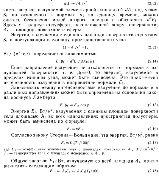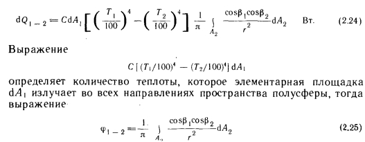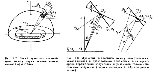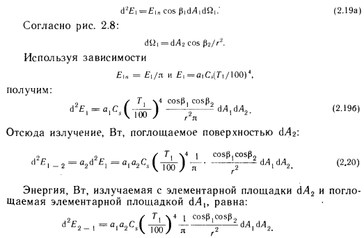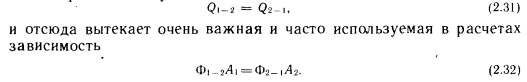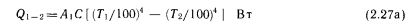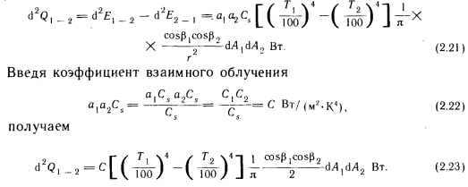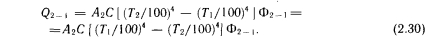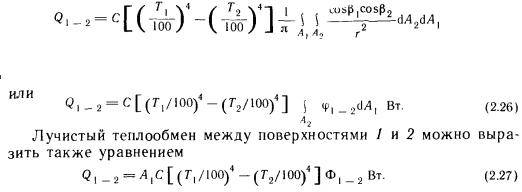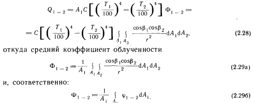 Лучистый теплообмен между двумя плоскими поверхностямиПри описании метода расчета лучистого теплообмена между двумя плоскими поверхностями, находящимися в произвольном положении, следует исходить из общего представления о лучистом теплообмене (рис. 2.7). В соответствии с этой схемой поступающую в пространственный угол ![]() ![]() С помощью приведенных выше основных уравнений можно определить лучистый теплообмен между двумя плоскими телами, находящимися в произвольном положении. Рассмотрим плоские поверхности площадью А и А г, имеющие температуру Г, и Т2 и коэффициенты поглощения а, и а2 (рис. 2.8), и рассчитаем теплообмен между этими поверхностями. На основании закона Ламберта бесконечно малое излучение второго порядка, Вт, поступающее с элементарной площадки dA и достигающее элементарной площадки d/b, можно выразить следующей зависимостью: ![]() В этом случае теплообмен определяется разностью собственных излучений, так как элементарной площадки 2 достигает лишь незначительная часть энергии, отражающейся от элементарной площадки 1. Поэтому теплообмен элементарных площадок dA 1 и dA2 выражается зависимостью ![]() Количество теплоты, передаваемой теплообменом между элементарной площадкой 1 и поверхностью 2, получается при интегрировании выражения (2.23) по площади А2. Между элементарными площадками изменяется только геометрическое соотношение, выражаемое коэффициентом cos Pi, т. e. ![]() Коэффициент ф в дальнейшем будем называть коэффициентом облученности между элементарной площадкой и поверхностью. Количество теплоты, которым обмениваются две полные поверхности, можно определить суммированием элементарных энергий, которыми обмениваются бесконечное число элементов площадью (находящихся на поверхности площадью А, и поверхность площадью А2, иными словами, интегрированием выражения (2.24) по площади А: ![]() Здесь произведение определяет теплообмен поверхности, имеющей абсолютную температуру Т, с охватывающей ее поверхностью, имеющей температуру Согласно рис. 2.8, до поверхности 2 доходит только часть излучения, испускаемого поверхностью 1. Эту часть выражает коэффициент ф 1 — 2, который представляет собой средний коэффициент облученности поверхности 2 поверхностью I. Слово «средний» указывает на то, что коэффициенты облученности поверхности 2 бесчисленным множеством элементарных площадок АА на поверхности 1 представляют собой переменные величины, зависящие от их взаимного расположения. По ним ниже будет вычислено среднее значение Ф — 2 Из двух приведенных выше уравнений получаем ![]() Последние уравнения получены исходя из закономерностей теплообмена на поверхности площадью А. Естественно, количество теплоты, участвующей в теплообмене, может быть выражено через поверхность площадью А2 и коэффициент облученности поверхностью 2 поверхности /: ![]() Таким образом, наблюдающийся теплообмен описан с двух точек зрения, ведь теплоотдача поверхности 1 в направлении поверхности 2 такая же, как теплопоглощение поверхности 2 от поверхности I, и наоборот. Поэтому ![]() Зависимость (2.27) в виде ![]() |