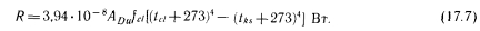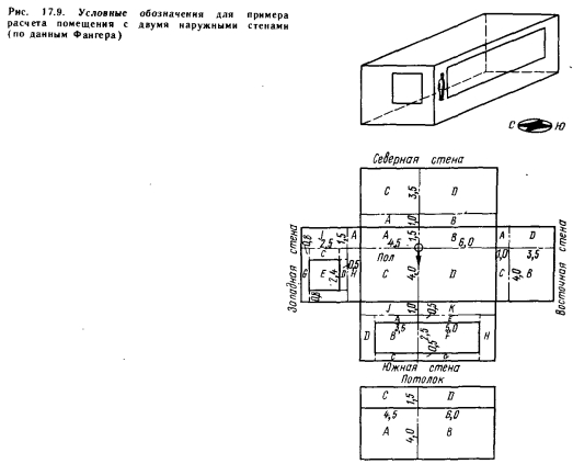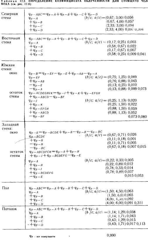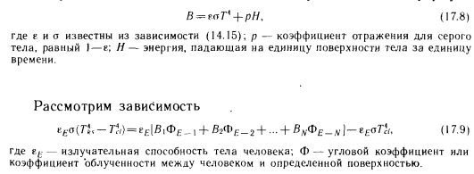 Метод ФангераПри использовании метода Фангера в теле человека не выделяют какие-либо части и рассматривают излучение, достигающее всего тела. Довольно сложно определяемую площадь поверхности тела человека Фангер вычислил с помощью оптических средств. Им же разработаны рассмотренные в п. 3.5 зависимости и диаграммы для расчета излучения, доходящего до поверхности тела человека. Для иллюстрации практического применения этого метода приведем из книги Фангера пример расчета теплоощущения человека, стоящего в определенном положении (рис. 17.9). Результаты расчетов сведены в табл. 17.2. Зная коэффициент облученности, излучающую поверхность и температуру тела человека, можно определить теплопоступление на него, а в ряде случаев и теплоотдачу в направлении холодных стен. В то же время, зная работу, выполняемую испытуемыми, и вырабатываемую при этом внутреннюю теплоту, а также ряд других важных параметров, можно сравнительно легко, не пользуясь уравнениями комфорта, определить условия тепловою равновесия. ![]() ![]() Для непосредственного определения лучистого теплообмена Фангер применял зависимость, упрощенную на основании исследований Геджа, Раппа, Харди и Столвийка: ![]() Для более точного, чем по зависимости (14.4), вычисления средней радиационной температуры Фангер исходил из следующих теоретических предпосылок. Излучение любого тела можно определить по формуле ![]() Можно отметить, что лучистый теплообмен человека с воображаемой черной окружающей поверхностью с температурой, равной средней радиационной, должен быть равен поглощаемой доле энергии, излучаемой окружающими поверхностями, за вычетом собственного излучения человека. Используя зависимость (17.9), среднюю радиационную температуру можно определить по формуле ![]() |