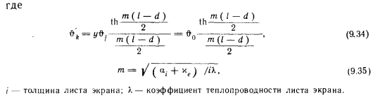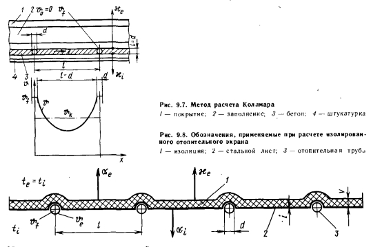 Метод расчета КоллмараДля исследования теплового потока в установленных отопительных приборах Коллмар использовал явление теплопроводности в одном направлении у стержня, нагреваемого с двух концов. Его метод расчета отличается от описанного выше тем, что толщина греющего листа принимается равной диаметру отопительной трубы d (рис. 9.7). Благодаря теплопроводности в одном направлении теплота проходит через греющий лист, затем вследствие теплоотдачи — с этого листа в пространство над конструкцией перекрытия и под ним. ![]() ![]() Коллмар предложил свой метод расчета с учетом экспериментальных данных, который применим для тех отопительных приборов, у которых из-за малой толщины греющего листа в его толще доминирует теплопроводность в одном направлении. Его следует использовать в первую очередь для отопительных экранов, где в гонком металлическом листе возникает теплопроводность в одном направлении, которая усиливается благодаря большому термическому сопротивлению покрывающей теплоизоляции, а также для бетонных греющих панелей. Условия, существующие при использовании изолированных отопительных экранов, иллюстрируются рис. 9.8. Избыточная температура отопительной трубы равна, но на линии соприкосновения экрана с трубой избыточную температуру следует принимать в зависимости от качества контакта между ними, согласно равенству ![]() Коэффициент у зависит от нескольких факторов, прежде всего от толщины воздушной прослойки. Как известно из опыта, у может принимать следующие значения: при сварном соединении между отопительной трубой и листом экрана t/ = 1,00; при хорошем механическом соединении и изолированном экране у = 0,90; при хорошем механическом соединении и неизолированном экране у = 0,80. Помимо качества соединения между отопительной трубой и листом экрана, важно знать, труба или листовое покрытие обращены к отапливаемому пространству, так как при этом на греющей поверхности возникают различные значения средней температуры, определяемые в соответствии со следующей зависимостью: ![]() ![]() У отопительных экранов, смонтированных близко к потолку, значение хе может включать термическое сопротивление перекрытия и воздушной прослойки, устраиваемой в качестве теплоизоляции, толщиной не более 10 см. Температуру части перекрытия между двумя отопительными экранами определяют исходя из того, что ее принимают как греющую поверхность между отопительными экранами. |