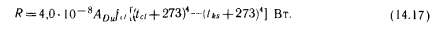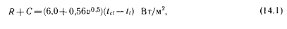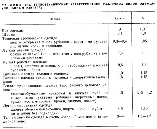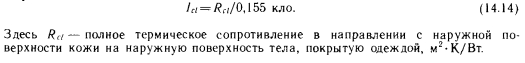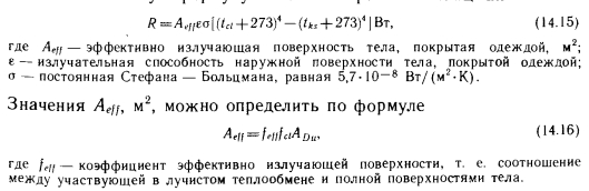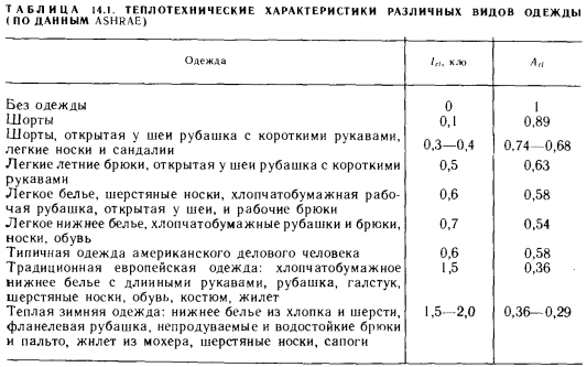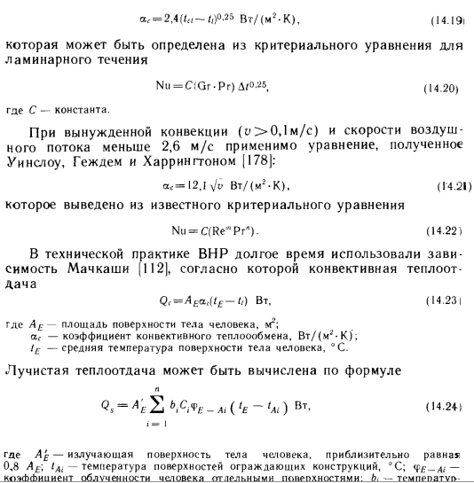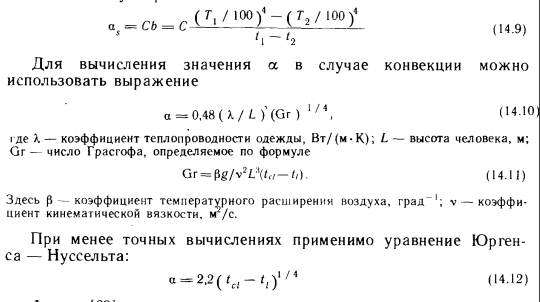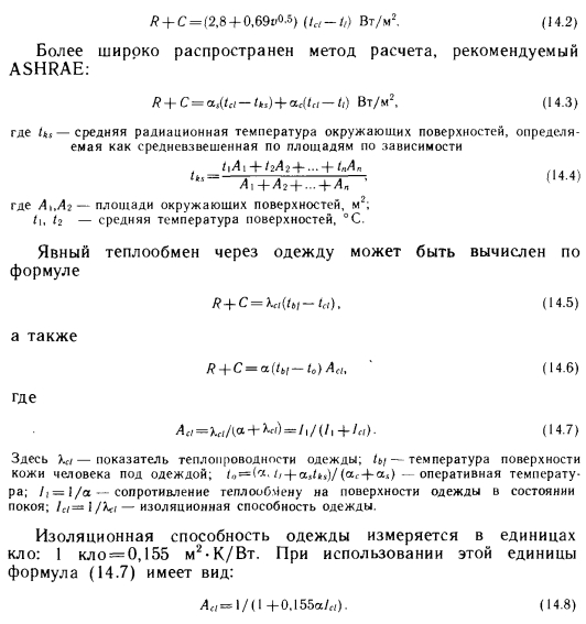 МЕТОДЫ РАСЧЕТА ЯВНОГО ТЕПЛООБМЕНА ТЕЛА ЧЕЛОВЕКАТеплообмен тела человека, как отмечалось выше, делится на явный и скрытый. В понятие явного теплообмена входят лучистый теплообмен (обозначаемый в дальнейшем буквой R), конвективный теплообмен (С) и теплопроводность. Существует множество методов расчета явного теплообмена. Для определения лучистой и конвективной теплоты Марселль и Хэтч [36] предлагают зависимость ![]() Для расчета теплообмена одетых людей Нельсон, Эйхман, Шелли и Хэтч [36] рекомендуют следующее выражение, представляющее собой в измененном виде зависимость (14.1): ![]() Для значений Ici и Aci составлены таблицы, из которых наиболее известны таблицы ASHRAE (табл. 14.1) и Фангера. Последняя является усовершенствованным, «более европейским» вариантом таблицы ASHRAE. Из табл. 14.1 видно, что значение Aci Для обнаженного человека равно 1, поскольку в этом случае изоляционная способность одежды не снижает явный теплообмен между телом и окружающей его средой. Однако с увеличением количества одежды значение Ас/ уменьшается. ![]() В сообщениях ASHRAE не указано, по какой формуле нужно вычислять значения а для конвективного и лучистого теплообмена. В случае лучистого теплообмена значение а можно определять по общеизвестному выражению ![]() Фангер [69] использует для определения теплопроводности через одежду более простое уравнение, а также табл. 14.2. Теплопроводность через одежду (с наружной поверхности кожи на наружную поверхность одежды) вычисляют по формуле ![]() ![]() ![]() Применяемая Фангером таблица аналогична табл. 14.1, но значения Id в ней определены для нескольких иных видов одежды и, кроме того, в табл. 14.2 указаны значения, соответствующие отношению между площадями покрытых одеждой и обнаженных поверхностей тела. Для расчета потерь теплоты путем излучения Фангер использует менее известную формулу закона Стефана — Больцмана: ![]() Подставляя известные значения в выражение (14.15), получаем: ![]() Для расчета потерь теплоты путем конвекции Фангер применяет следующий метод. Потери теплоты путем конвекции с наружной поверхности покрытой части тела равны: ![]() Значение hc, естественно, зависит от параметров воздуха. ![]() Хотя большинство приведенных выше зависимостей имеет общий характер, ранее они использовались достаточно широко. Однако для расчета влияния лучистого теплообмена на теплоощущение в настоящее время применяют другие методы, которые служат основой современного расчета теплоощущения. |