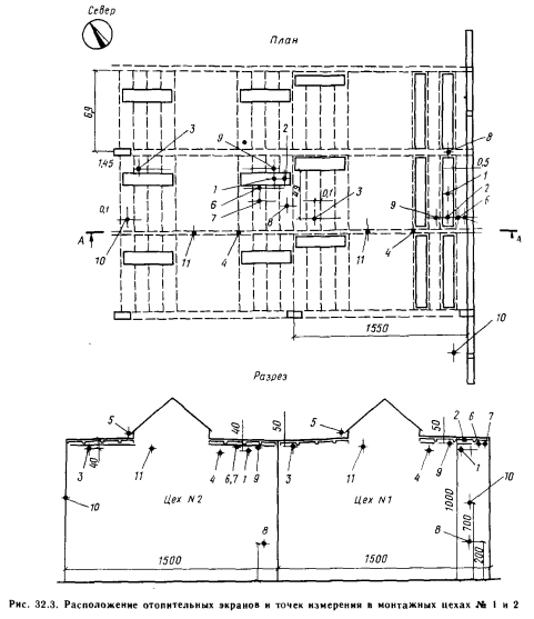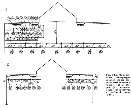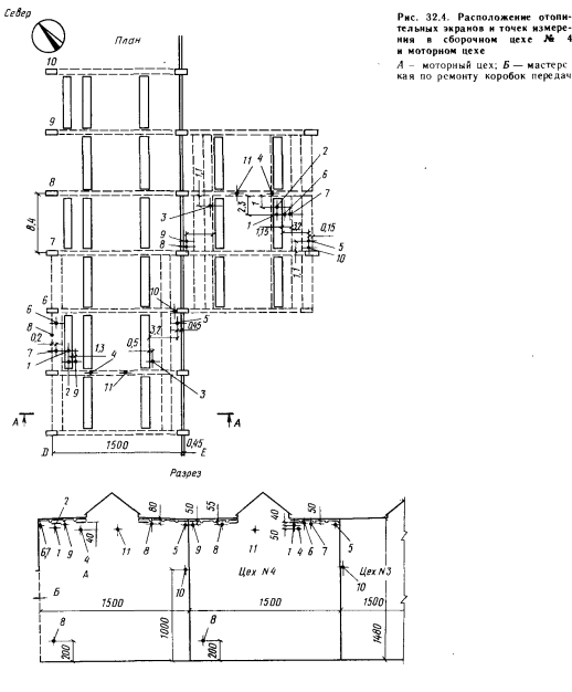 Помещения сборочных цехов Северной базы ремонта транспортных средств венгерских государственных железных дорогВ сблокированном здании имеется девять смежных крупных помещений павильонного типа, отапливаемых экранами. Расположение помещений и их основные размеры приведены на рис. 32. 2. Замеры осуществлялись в четырех характерных помещениях, отличающихся друг от друга высотой и типом ограждающих конструкций. Выбранные помещения имеют следующие характеристики. Сборочный цех № 1: высота 10 м, продольная наружная стена обращена на восток, общее воздушное пространство с расположенным рядом сборочным цехом № 2. Сборочный цех № 2: высота 10 м, без продольных стен, общее воздушное пространство со сборочным цехом № 1 и проездом для платформ. Сборочный цех № 4: высота 14 м, с одной стороны — общее воздушное пространство со сборочным цехом № 3, высотой также 14 м, с другой стороны имеется продольная стена, обращенная к помещению моторного цеха. Моторный цех: высота 14 м, продольная перегородка обращена к сборочному цеху высотой также 14 м, общее воздушное пространство без перегородки с мастерской по ремонту коробок передач, имеющей высоту 10 м. Расчетное значение коэффициента теплопередачи перлитобетонного покрытия здания составляет 1,4 Вт/(м 2. К). Зенитные фонари и боковое остекление однослойные, со стальными рамами. Внутренние теплопоступления в цеховых помещениях ничтожно малы и составляют 1—2% суммарных теплопотерь. Отопительные экраны имеют следующие размеры: ширина 750 мм, длина 2000, 4000, 5000 и 6000 мм, расстояние до резьбы отопительных труб 18 см, теплоизоляция — маты из стекловаты толщиной 3 см, покрытые толем. В южном конце производственных помещений имеется общий коридор высотой 5 м, а также административные помещения. На северной стороне часть пространства занята вспомогательными помещениями, а часть — наружной стеной. В качестве теплоносителя для системы отопления был выбран насыщенный пар с давлением 0,4 МПа. Согласно первоначальному проекту, этот пар цех должен был получать по линии централизованного теплоснабжения от Кёбаняйской электростанции. В связи с возникновением неожиданных препятствий теплофикация началась позднее, а поскольку котлы цеха не выдерживали больших нагрузок, для обеспечения отопления было принято вынужденное решение, при котором отопительная система в основном работала лишь ночью, по 10—12 ч. Давление пара в период замеров колебалось от 0,22 до 0,25 МПа, т.е. было ниже предполагавшегося при расчете отопительных экранов. Замеры во всех цеховых помещениях производили с помощью выверенных регистрирующих термогигрографов. Показания приборов во время замеров контролировались с помощью ртутных термометров. Для более тщательного контроля температурных полей, образующихся вокруг отопительных экранов, ночью производили замеры ртутными термометрами. Расположение отопительных экранов и точек измерения в сборочных цехах №№ 1 и 2 показано на рис. 32.3, в сборочном цехе № 4 и моторном цехе — на рис. 32.4. В моторном цехе дополнительно несколько точек были проконтролированы ночью с 23 до 3 ч с помощью ртутного термометра. Результаты этих измерений приведены на рис. 32.5. На основании результатов измерений были сделаны следующие выводы. 1. Разность температуры в рабочей зоне и в пространстве под покрытием составляет всего 1—3°С