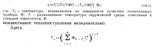 Общие положенияВысокотемпературные инфракрасные излучатели существенно отличаются от рассматривавшихся выше лучистых отопительных приборов. В первом случае теплоноситель нагревается благодаря горению, осуществляющемуся на центральной установке, и поступает в теплоотдающие устройства, затем оттуда, отдав часть своей теплоты, возвращается в центральный теплогенератор. Отличительной чертой приборов другого типа является использование теплового воздействия электрического тока, с помощью которого на поверхности конструкции достигается высокая температура. В последнее время изготавливают также инфракрасные излучатели, в которых в качестве теплоносителя используют масло. Характерной особенностью указанных трех видов отопительных приборов является то, что эти приборы рассчитаны на определенную теплопроизводительность и в таком виде поступают потребителю, т. е. расчет отопительного прибора проектировщиком не производится. Эти отопительные приборы монтируют главным образом на довольно большой высоте таким образом, чтобы греющая поверхность была обращена вниз. Прибор имеет боковые направляющие листы, препятствующие конвективному теплообмену, поэтому по сравнению с лучистым теплопоступлением, выражаемым зависимостью ![]() Лучистый отопительный прибор с температурой поверхности 1000°С и коэффициентом взаимного излучения С = 4,85 Вт/(м2-К) имеет лучистое теплопоступление в направлении окружающей среды с температурой = 20°С ![]() Высокотемпературное лучистое отопление имеет следующие преимущества: высокое удельное теплопоступление; обеспечение приблизительно 95% теплопоступления в виде излучения; небольшие капитальные затраты; возможность быстрого ввода в действие; возможность регулирования излучения в зависимости от расположения плоскости отопительного прибора. Вместе с тем этот метод имеет ряд недостатков: не всегда обеспечивается хорошее самочувствие людей в обогреваемых помещениях; существует большая возможность возникновения несчастных случаев при эксплуатации (опасность пожара и взрыва); работа прибора в большой степени зависит от бесперебойной работы коммунальных сетей по сравнению с другими системами отопления; имеется меньшая возможность регулирования излучения. Указанные особенности определяют область применения таких приборов. Она распространяется прежде всего на крупные одноэтажные промышленные здания, временно или периодически используемые сооружения и помещения, открытые помещения. |