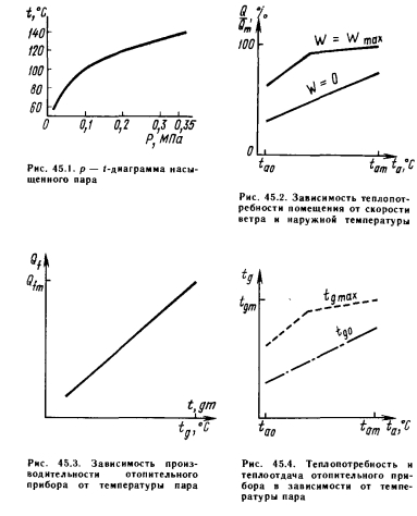 Общие положенияРассмотрим теоретические основы и возможности регулирования систем парового отопления, беря за основу работы д-ра Роберта Кишша и д-ра Золтана Мольнара [94]. При использовании установок, в которых в качестве теплоносителя применяют пар, регулирование теплоотдачи можно осуществлять путем изменения расхода пара т, температуры пара tg, скрытой теплоты парообразования л, а при использовании теплообменника—изменением его теплоотдающей поверхности Л/, коэффициента теплопередачи kf и коэффициента теплообмена а. При паровом отоплении регулирование также можно проводить путем изменения температуры (изменение tg и г) и расхода (изменение давления насыщенного или перегретого пара). В этом случае два способа регулирования отличаются друг от друга не так четко, поскольку путем изменения давления насыщенного пара можно достигнуть смешанного, качественного и количественного регулирования. Чисто температурное регулирование может быть обеспечено только при использовании пара с постоянным давлением, но переменной температурой, т. е. перегретого, а чисто количественное регулирование должно достигаться с помощью насыщенного пара с постоянной температурой при изменении давления, что неосуществимо. Поскольку применения перегретого пара в отопительных установках стараются избегать, чаще всего используется только количественное регулирование. Однако случай, когда сравнительно небольшое изменение давления приводит к значительному изменению температуры (р—-диаграмма для насыщенного пара на рис. 45.1), считается температурным регулированием. К таким системам относится выкуум-оаровая система, которая, однако, для лучистого отопления используется очень редко. ![]() |