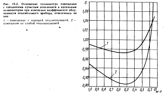 Оценка уравнений теплового балансаДля лучистого отопления последняя система уравнений теплового баланса может быть решена достаточно точно, так как распределение температуры воздуха, а значит, и температуры ограждающих поверхностей более равномерны, чем при использовании других систем отопления. Например, при применении радиаторного отопления температура части стены за радиатором и поверхности окна, расположенного над ним, существенно больше, чем получаемая из уравнений теплового баланса. Учет значительной неравномерности распределения температуры воздуха по высоте помещения также связан с большими затруднениями. На рис. 18.2 показано отношение теплопотерь Qos, возникающих в помещении с лучистым отоплением, к идеальным теплопоте- рям е = Qns/Qoid, определяющее степень экономии теплоты при устройстве лучистого отопления. Кривые на рис. 18.2 построены для сплошного или ленточного потолочного отопления. Эксперименты на модели показали, что теплопотери снижаются при применении греющих панелей, устраиваемых в стенах, или при напольном отоплении. ![]() Следует заметить, что как Qos, так и Q0id уже включают в себя «угловую добавку», или «добавку на самочувствие». Как экспериментально, так и теоретически с хорошим приближением можно доказать, что в помещении с радиаторным отоплением теплопотери без добавки почти на 9—10% больше, чем идеальные теплопотери QoW, служащие основой для сравнения. Теплопотери же, возникающие при лучистом отоплении, меньше идеальных в помещении с обычными размерами и нормальной теплоизоляцией на 1,5—2,5%, а при слабой теплоизоляции — на 6—8%. Добавки, применяемые при расчете трансмиссионных теплопотерь по стандартам, увеличивают эту разницу при радиаторном отоплении и создают запас при лучистом отоплении. На основании этого можно сделать вывод, что теплопотери, рассчитываемые согласно современным венгерским стандартам, сокращаются на 10% при использовании потолочного лучистого отопления. |