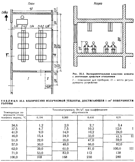 Описание экспериментовИсследования проводились с тринадцатилетними школьниками в экспериментальном классном помещении отдела охраны здоровья детей и молодежи Венгерского института здравоохранения. Эксперименты проводились с 14 до 16 ч 30 мин. Ученики в течение 10—15 мин после пребывания адаптировались к температурным условиям, а затем в течение 2 ч готовили уроки к следующему дню. Вначале они выполняли письменные задания, после чего заучивали материал по учебникам. По истечении 1 ч работы объявляли перерыв, во время которого помещение проветривали, а учащиеся выходили на открытый воздух. В этих условиях можно было достаточно точно воспроизвести ситуацию, складывающуюся в период учебы в школе, когда ученики фактически не занимаются непрерывной умственной работой более 45—50 мин, а во время 10-минутных перемен классные помещения проветривают. Физиологические исследования и теплотехнические измерения производились до начала учебы, а также по окончании двухчасовой умственной нагрузки. При радиаторном отоплении замеры были произведены 37 раз, а при лучистом отоплении — 77 раз. При радиаторном отоплении были измерены 23 теплотехнические характеристики, а при лучистом отоплении — 32. При физиологических обследованиях фиксировалось по 13 характеристик в каждом случае для радиаторного и для лучистого отопления. Таким образом, за весь период измерений всего было получено 2300 теплотехнических и 17 800 физиологических характеристик. Классное помещение отдела охраны здоровья детей и молодежи Венгерского института здравоохранения, выбранное для экспериментов, имеет в плане размер 6,36X4,5 м и высоту 3 м. Наружная стена классного помещения длиной 6,36 м имеет два окна с двойным остеклением. Остальные ограждающие конструкции, а также пол и перекрытие граничат с отапливаемыми административными помещениями или внутренними коридорами. Отопление помещения обеспечивается водяной насосной системой с температурой воды 90°С (температура обратной воды 70°С), имеющей под окнами два 13-секционных чугунных радиатора высотой 600 мм. При проектировании классного помещения теплопотери были приняты равными 3140 Вт. Проветривание классного помещения на переменах, как и в подавляющем большинстве школ, обеспечивается открыванием окон. Для исходных измерений использовали существующую радиаторную отопительную установку. При устройстве экспериментального лучистого отопления было проверено, какие параметры могут изменяться в данных условиях. Установлено, что к таким параметрам относятся температура поверхности отопительного экрана, коэффициент облученности и температура воздуха в помещении. Для контроля изменения этих параметров была изготовлена специальная экспериментальная отопительная установка. Поскольку температуру греющей поверхности нельзя было произвольно регулировать ни непосредственно отопительными экранами, действующими на горячей воде и подключенными к имевшейся ранее системе отопления с насосной циркуляцией, ни путем смешивания, была смонтирована система электрического лучистого отопления. Отопительные экраны разместили попарно над двумя рядами парт в классном помещении (рис. 35.2). Высоту подвески отопительных экранов варьировали с помощью полиспаста. Изменять коэффициент облученности можно было как регулированием высоты подв