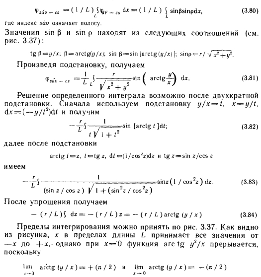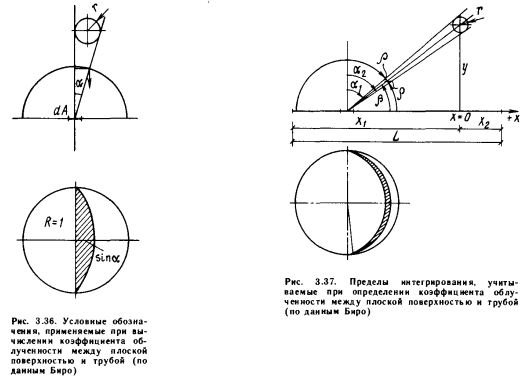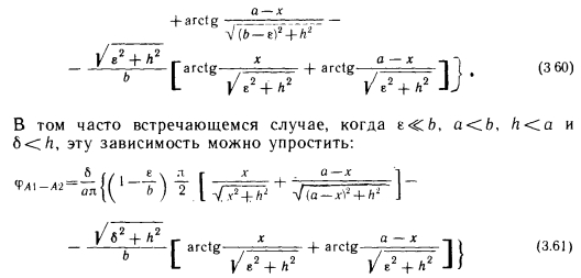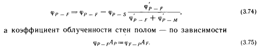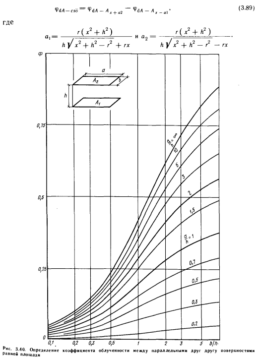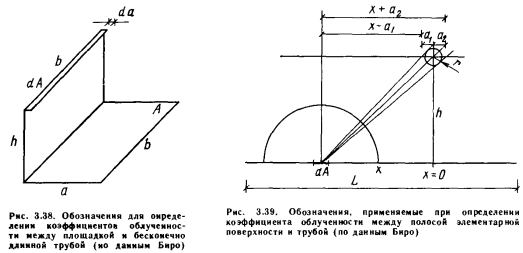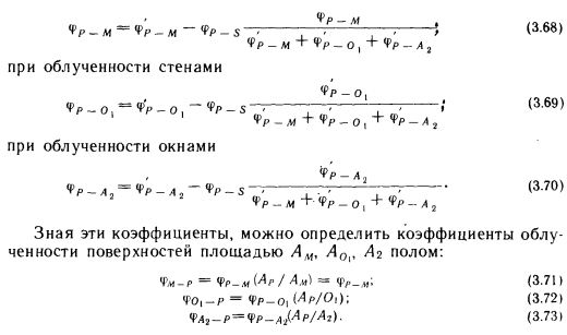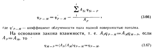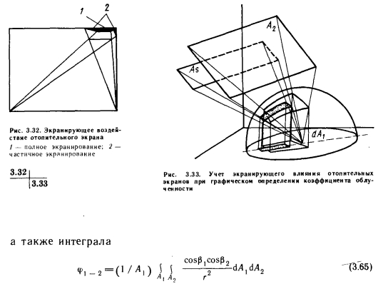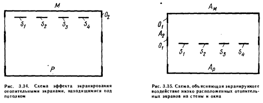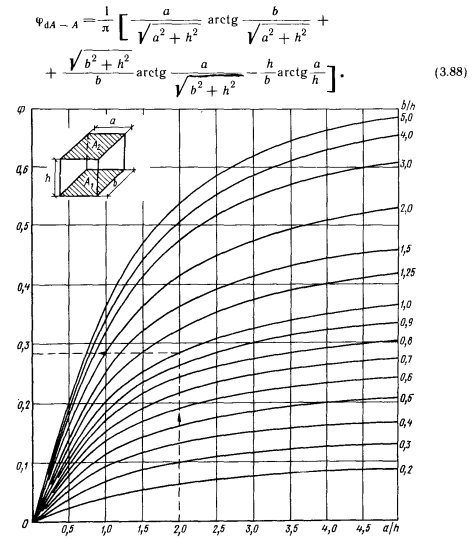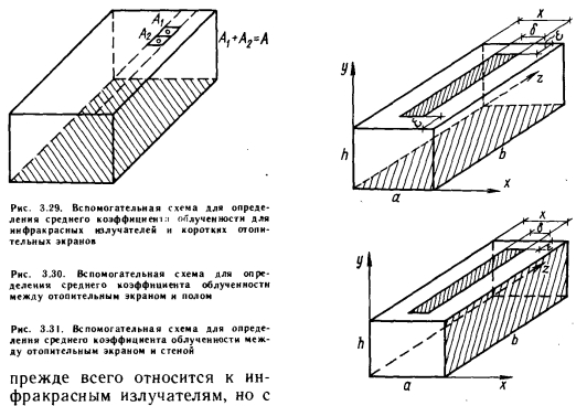 Особый случай определения коэффициента облученности между поверхностямиПри проектировании экранных излучателей для крупных одноэтажных промышленных зданий существенное значение имеют определение среднего коэффициента облученности и учет влияния экранирующих поверхностей при вычислении последнего. Расчет среднего коэффициента облученности для лучистого теплообмена между поверхностями. Средний коэффициент облученности между поверхностями вычисляют по формулам (2.29а) и (2.296). Однако имеющиеся в литературе расчетные данные относятся прежде всего к помещениям, имеющим форму призмы. Расчет коэффициентов облученности для экранных излучателей, частей стен (например, окон), имеющих значение в практике проектирования, разработан только с применением сложных методов и с некоторым приближением. В методе, исключающем упомянутые недостатки, используется уже рассмотренная зависимость (2.32). Преимущество здесь заключается в том, что достаточно определить коэффициент облученности для одной из поверхностей, участвующих в теплообмене, второй же может быть просто вычислен по приведенной зависимости. На практике встречаются задачи двух типов. В первом случае можно считать, что экран расположен вдоль продольной оси помещения по всей его длине, в крайнем случае он может быть меньше нее у краев на небольшое расстояние е. Во втором случае предполагают, что размеры экрана по сравнению с размерами помещения малы. Тогда экран можно заменить одной-двумя элементарными площадками, расположенными на поверхности, и исходя из этого, вычислить коэффициент облученности для пола. Это прежде всего относится к инфракрасным излучателям, но с хорошим приближением такой метод можно применить для коротких экранов, особенно если их поверхность разбить на небольшие площади, например, в соответствии с рис. 3.29: ![]() ![]() Параметр фл-р можно определить как коэффициент облученности элементарной поверхности 1 с площадкой d/4i, находящейся посередине части экрана. Подобным же образом можно поступить и при вычислении коэффициента облученности для стен. Коэффициент облученности плоскости размером экранами с площадью поверхности, расположенными от нее на высоте h, при важном для нас условии, когда 8а, может быть определен по следующей зависимости (рис. 3.30): ![]() ![]() ![]() Учет экранирования при расчете коэффициента облученности между поверхностями. При вычислении температуры помещения, где применяется лучистое отопление, для определения теплового баланса между отдельными ограничивающими поверхностями следует принимать во внимание экранирующее влияние подвешенных экранов, что проявляется в изменении коэффициента облученности отдельными поверхностями друг друга (рис. 3.32). Поэтому при экранирующем воздействии экранов нужно определить коэффициенты облученности, а также их сопряженные коэффициенты облученности. Принцип решения показан на рис. 3.33. В соответствии с этим при решении интеграла ![]() ![]() Если требуется расположить экраны на небольшом расстоянии от потолка, то в большинстве случаев они не экранируют какие- либо поверхности кроме потолка, при этом после определения коэффициента облученности отдельных экранов полом коэффициент облученности пола неэкранированной поверхностью потолка можно определять по зависимости ![]() ![]() Коэффициент облученност