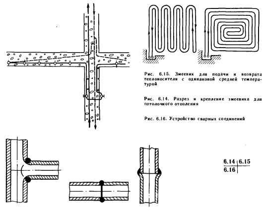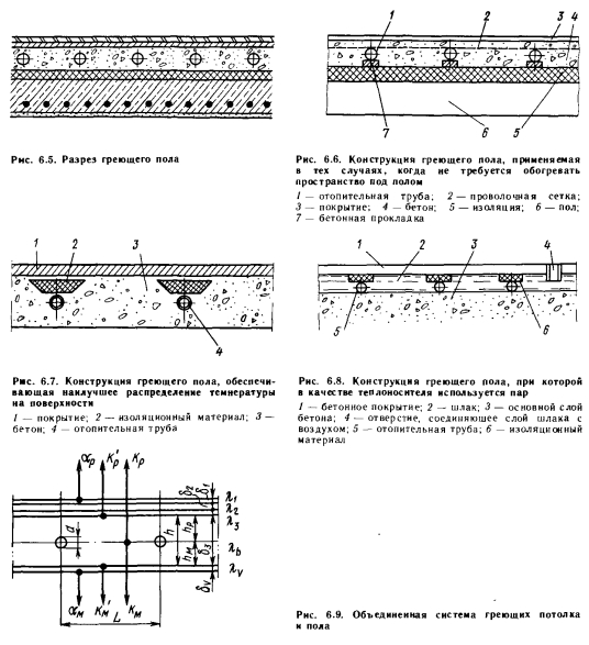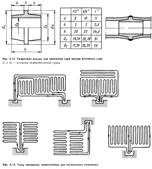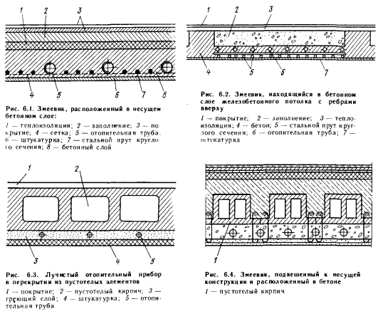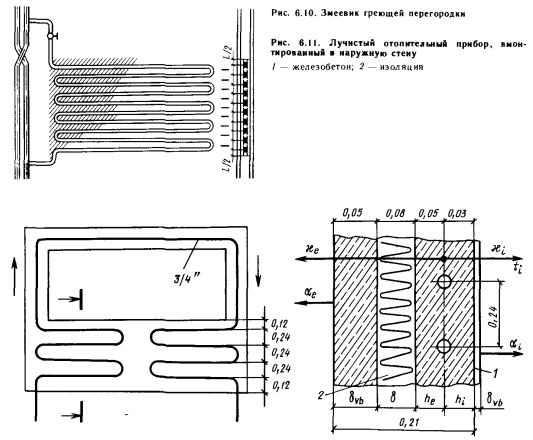 Отопительные приборы со змеевиком, расположенным в слое бетонаЛучистый отопительный прибор с трубами, находящимися в слое бетона, может быть расположен в потолке, в наружной или внутренней стене и в полу. Основной частью прибора являются трубы или электрическая линия, проходящие в слое бетона и подающие теплоноситель. Если последний — вода или пар, то применяют стальные трубы, а при использовании электрического тока в качестве теплоисточника — изолированную металлическую проволоку. Прокладка змеевика в бетоне возможна прежде всего благодаря тому, что коэффициенты теплового расширения стали и бетона мало отличаются друг от друга, а также тому, что коэффициент теплопроводности бетона достаточно высок. Коэффициент теплового расширения бетона рь= 1,15-10-5 м/(м-°С), а мягкой стали ро = 1,0-10-5 м/(м-°С); коэффициент же теплопроводности бетона Кь= 1,2—1,4 Вт/(м°С). Разница между коэффициентами теплового расширения этих материалов компенсируется тем, что температура стали с меньшим коэффициентом теплового расширения выше, чем температура бетона. В бетоне, естественно, возникают напряжения, поскольку распределение температуры неравномерно, однако возникающие напряжения ослабляются постоянством температурного распределения. Если бетонный слой служит только составной частю отопительного прибора, то рекомендуется следующий состав бетона: 4 вес. ч. мелкого гравия (крупность зерна менее 0,005 м), 2 вес. ч. речного песка, 1 вес. ч. портландцемента. Если слой бетона предназначен также для обеспечения прочности, то это учитывается при назначении его состава. Минимальную толщину бетонного слоя подбирают таким образом, чтобы отопительные трубы с обеих сторон были покрыты слоем бетона толщиной не менее 15—20 мм. Приборы, которые имеют отопительные трубы, расположенные в бетоне, обладают следующими преимуществами: степень использования стали достаточно высокая — 1 кг забетонированной стали в зависимости от температуры теплоносителя может обеспечить тепловой поток 60 — 100 Вт; полезное пространство помещения не сокращается; очистка поверхности не создает особых проблем, поскольку ее можно мыть при соответствующем окрашивании. Однако эти приборы имеют и ряд недостатков: при большой толщине бетонного слоя возможна значительная тепловая инерция, что отражается на быстроте регулирования; если монтаж системы отопления производится в основном на месте, то требуется очень тщательное выполнение работ. Однако в последнее время чаще применяется заводское изготовление отопительных приборов; при необходимости нельзя изменить размеры отопительных приборов. ![]() Варианты конструкции обычного лучистого отопительного прибора, размещенного в потолке. Различные решения отопительного прибора определяются конструкцией потолка и толщиной бетонного слоя. Последняя влияет и на способ расчета. На рис. 6.1 показана система отопительных труб, расположенных в несущем слое бетона. Если снять верхнюю изоляцию и в бетонный слой поместить только охватывающую прокладку и покрытие, то получится комбинированное отопление, размещенное в потолке и полу. На рис. 6.2. изображен железобетонный потолок, снабженный сверху ребрами жесткости. Его тепловая инерция меньше, чем у потолочного отопительного прибора, показанного на рис. 6.1. Лучистый отопительный прибор, расположенный 