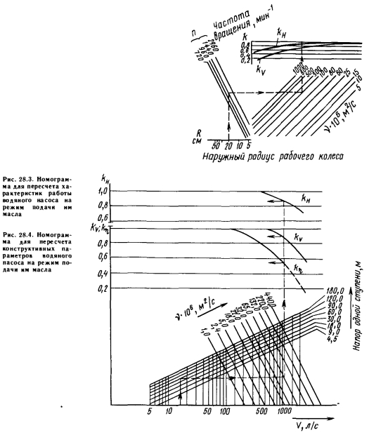Пересчет характеристик водяного насоса на режим подачи маслаТехнические характеристики центробежных Засосов определяют на основании экспериментов, проводимых с водой, имеющей температуру 16—20° С, а плотность воды принимается равной 1000 кг/м3, что соответствует температуре воды 4°С. Если насос подает жидкость с характеристиками, отличающимися от упомянутых, условия эксплуатации, естественно, несколько изменяются. Это объясняется изменениями вязкости, плотности жидкости и в общем случае содержанием в ней твердых частиц. При подаче масла следует руководствоваться только изменением плотности и вязкости, поскольку в масле, профильтрованном должным образом, нет твердых частиц. При использовании жидкости, отличающейся от воды, изменяются подача V, высота подачи (напор) Я, коэффициент полезного действия т и потребляемая мощность N насоса, т. е. одновременно все его характеристики. Изменение плотности сказывается только на потребляемой мощности, а на подачу, напор и коэффициент полезного действия оно не влияет. Изменение вязкости влияет на гидродинамические параметры и условия гидравлического трения в насосе. Увеличение вязкости до некоторого предела можно считать выгодным, поскольку оно уменьшает коэффициент объемного расширения и потери через неплотности насоса. Это преимущество сохраняется до тех пор, пока увеличение потерь от трения из-за увеличения вязкости незначительно, поскольку гидравлические потери центробежного насоса вызываются прежде всего трением. Увеличение вязкости при постоянной подаче снижает напор и одновременно увеличивает потребляемую мощность. Для условий, отличных от характерных для воды, подачу, высоту подъема жидкости, коэффициент полезного действия и потребляемую мощность можно точно определить только в результате испытаний. Однако новые характеристики насоса можно получить и с помощью номограмм, приведенных на рис. 28.3 и 28.4, умножая первоначальные характеристики насоса на получаемые из номограмм поправочные коэффициенты. Из номограмм можно определить следующие коэффициенты: kv изменяющий подачу насоса, k н, выражающий изменение напора, и показывающий изменение коэффициента полезного действия. В результате получаем измененные величины, обозначенные индексом т: ![]() Мощность, потребляемая насосом, равна: ![]() Таким образом, используя поправочные коэффициенты к, эксплуатационные характеристики водяных насосов можно пересчитать и для подачи ими масла. Необходимо оговориться, что водяные насосы приемлемы для подачи масла только в том случае, когда насос приспособлен для подачи среды с температурой 200—300°С. |
